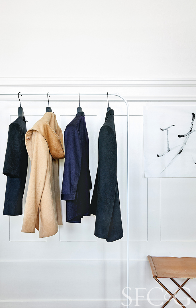 Cashmere coats from the Lan Jaenicke collection hang next to calligraphy by the designer.