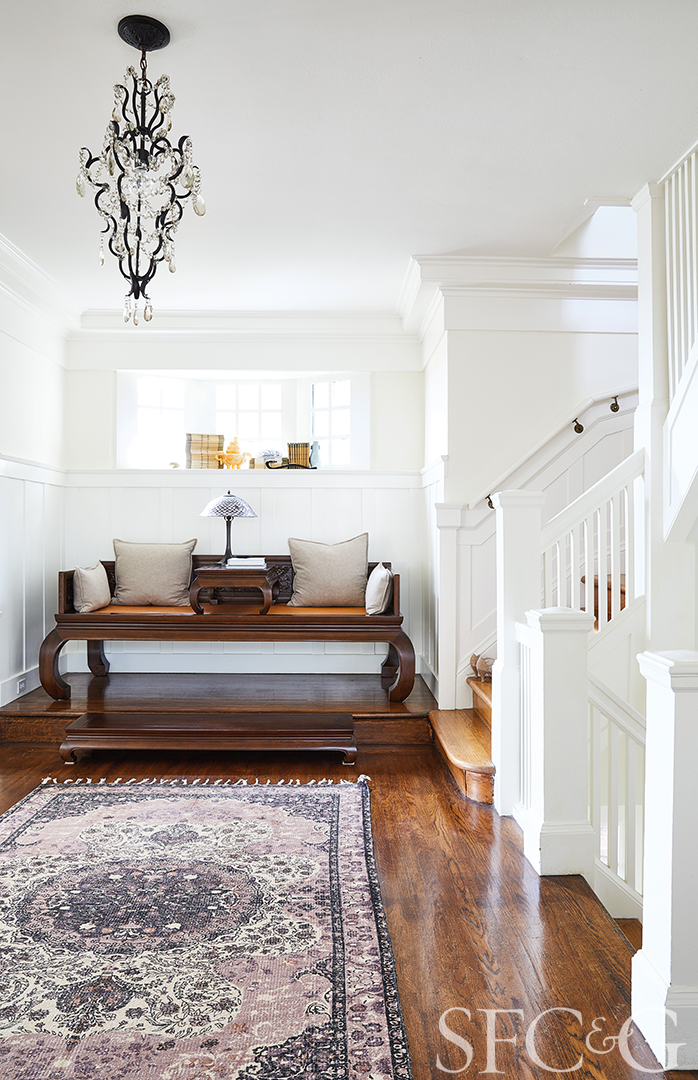The foyer is graced by a Chinese day bed crafted from 100-year-old Elm wood hand-selected by Jaenicke’s parents. The chandelier is vintage.