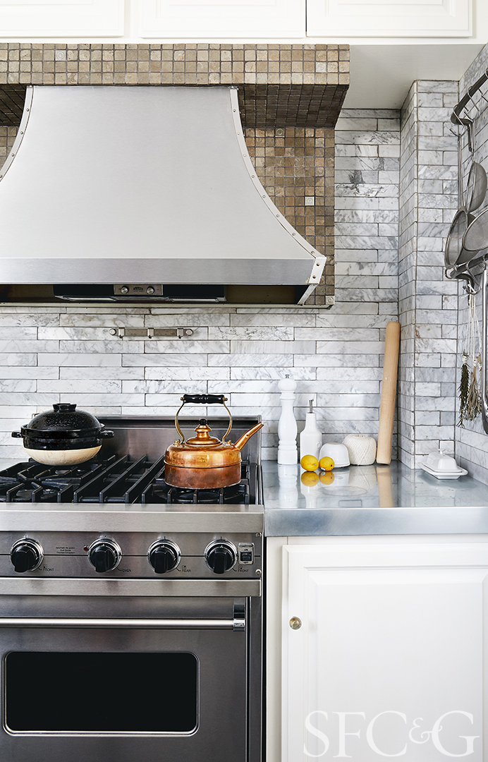 Carrara marble tile backs the Broan hood and Viking stove in the kitchen.