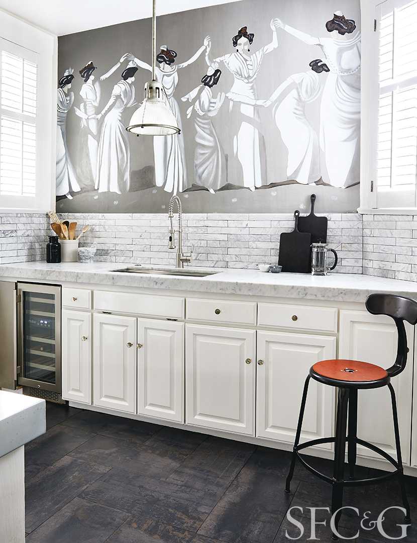 Jaenicke kept the charming Art Deco mural in the kitchen painted by the home’s previous owner. The counter stool is by Nicolle.