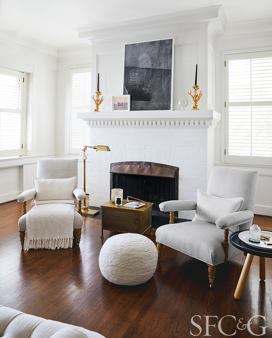 Chairs from RH flank a vintage brass firewood storage box from Le Cart used as a side table. The white pouf is from CB2; black-topped table is through Zinc Details. Atop the mantel are Untitled from Classon by Daisuke Yokota and Mountain Twice by Sean McFarland, both through Casemore Kirkeby.