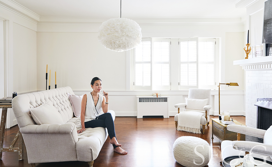 Lan Jaenicke, seated atop an RH sofa, enjoys the quietude of her living room. The Empire candle stands are from Hudson Grace. The Vita goose-feather chandelier is through Jessie Black.