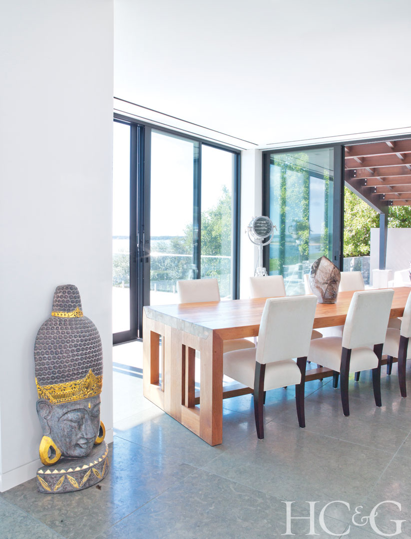 Lillian August chairs surround a reclaimed-teak table in the dining area. The carved wood head is from Thailand.
