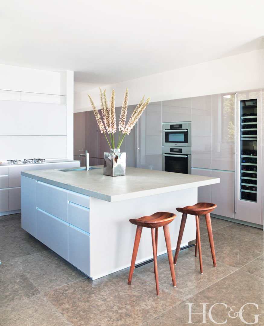 Glass cabinetry by Valcucine lines the walls of the adjacent kitchen, where walnut stools from Design Within Reach sit below a lava-stone island countertop. The ovens are by Miele and the wine refrigerator is by Gaggenau.