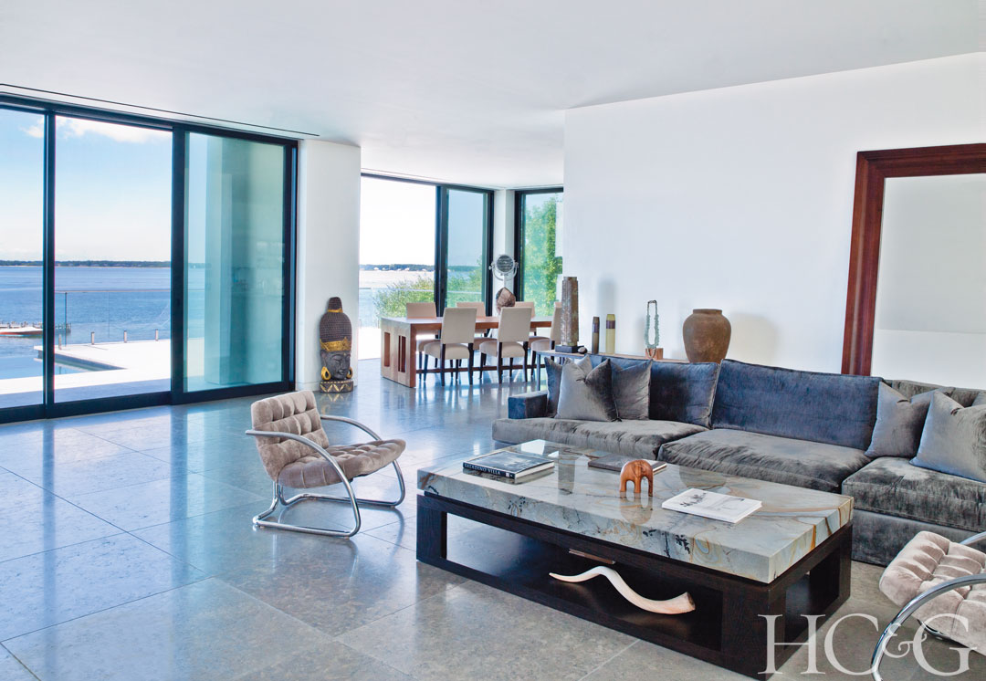 A seating area in the open living room features velvet-upholstered vintage chairs, a Raul Carrasco sofa, and a Japanese celadon quartz–topped cocktail table, also by Raul Carrasco. The floor is covered in slabs of Cenia Azul limestone.
