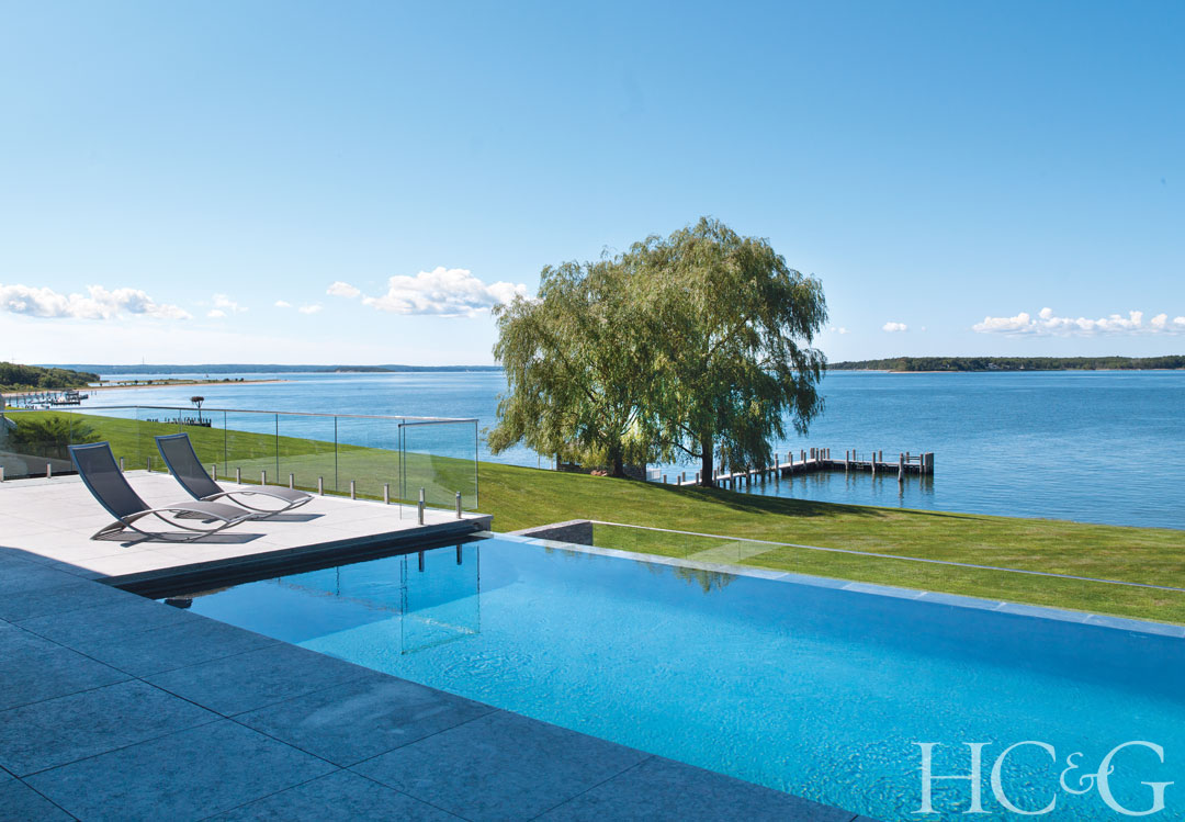 The home’s upper-level infinity pool, situated off the living room, flows into a smaller pool below. The chaise longues are from Oasiq.