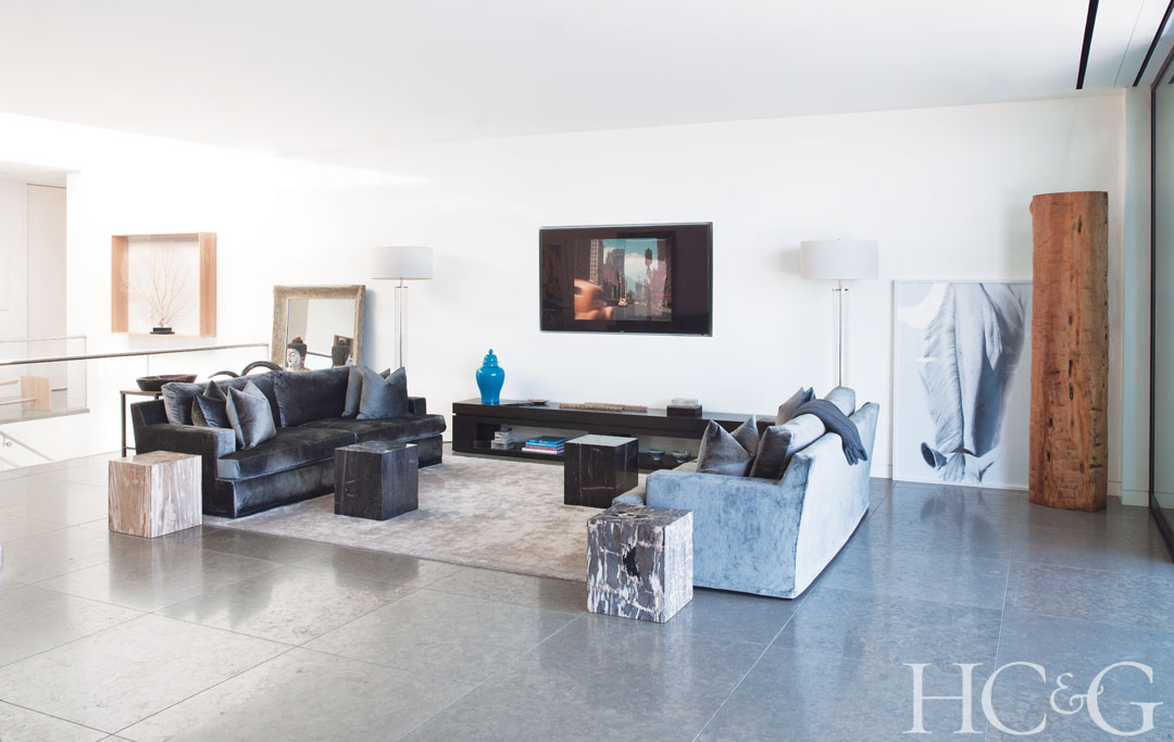 The adjacent sitting area features Restoration Hardware floor lamps, Raul Carrasco sofas, a Stark rug, a Bob Tabor photograph, and an African tree trunk.
