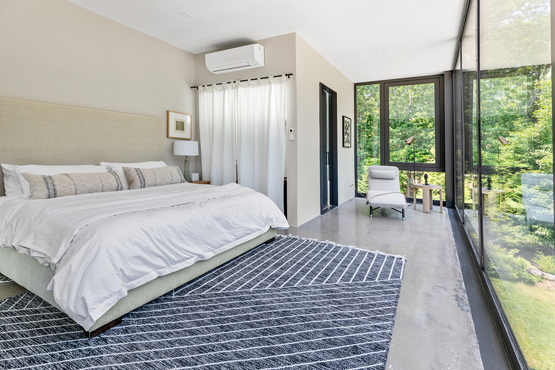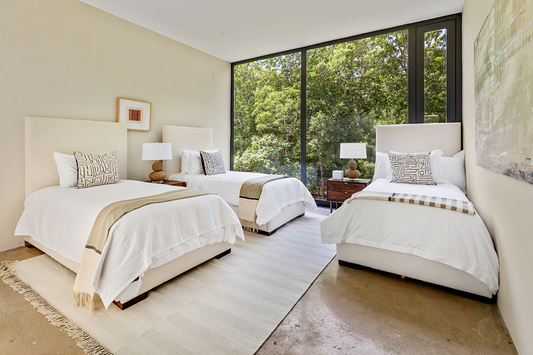 The sightlines of the home extend from the front door all the way to the back, and you can quite literally see from one side of the house to the other. Exuding an industrial yet sleek feel inside, the kitchen features custom cabinetry from Scavolini and brand-new appliances from Gaggenau so an avid cook can feel right at home. The upper level has a slightly different vibe. Looking down at the main level and finally boasting some white walls, it has a minimalist, art gallery-esque atmosphere. It also holds all six bedrooms and bathrooms, with two primary suites sitting separately from the guest suites.