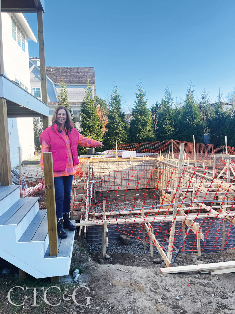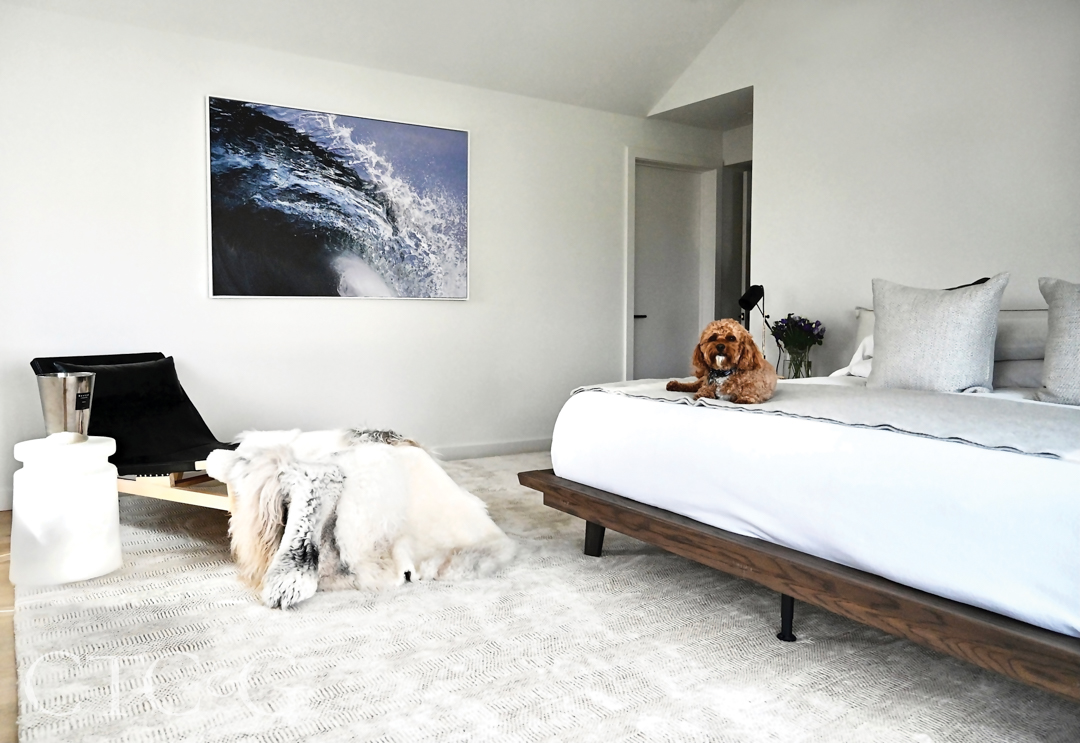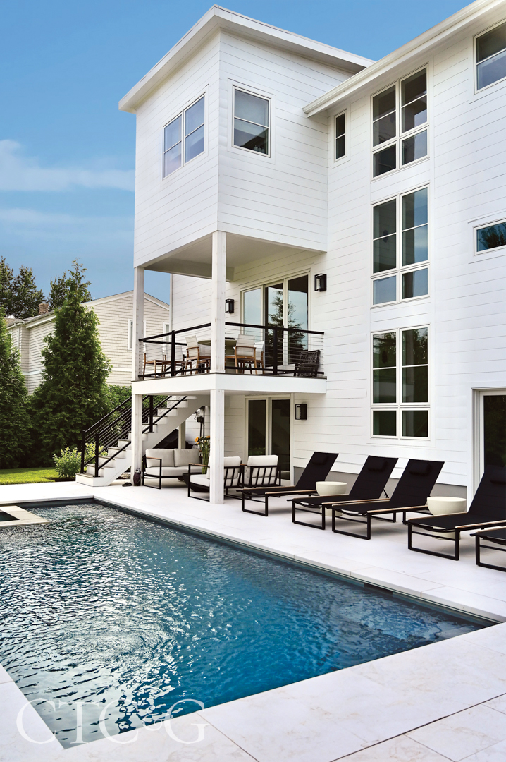 Glenn had a vision to make the older ranch into a modern, vertical beach house with a separate ground-floor entrance, plus an open layout of living spaces on the first level that includes a large great room, custom kitchen and dining space that lends itself to entertaining. The couple added a pool with a natural stone patio and created a beautiful two-level walkout to the outdoors to make the home a truly four-season space. One level up the sunlit staircase from the living spaces, the bedrooms include a Jack-and-Jill setup that the kids use when they visit, and a primary bedroom with a vaulted ceiling and a large custom closet where Jamie keeps her impressive handbag collection. The top floor has an office and a large terrace with views of the water.