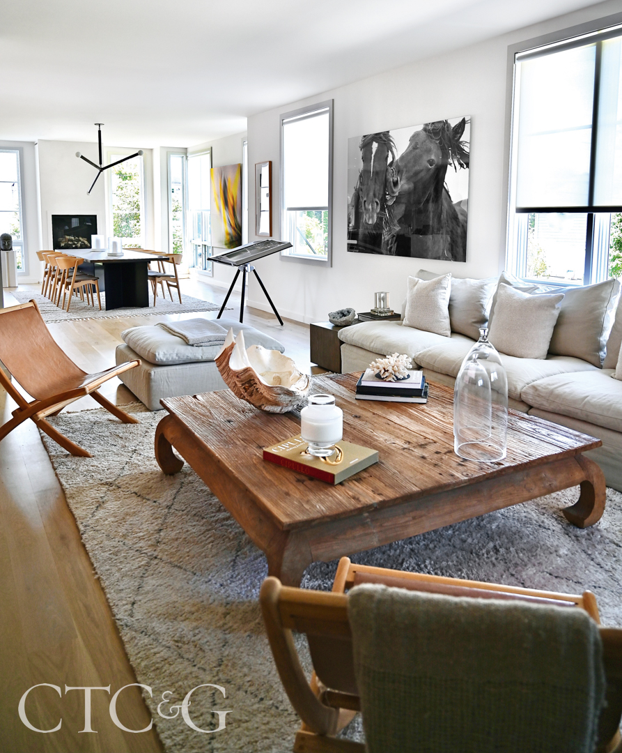In the living room, an RH sofa and leather sling chairs from Stowed Home surround a large coffee table atop a rug from Lillian August. Photography by Heather Desmond