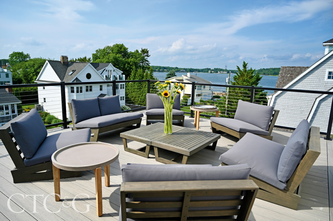 On the roof deck, teak furniture is the perfect perch for enjoying the view. Photography by Heather Desmond