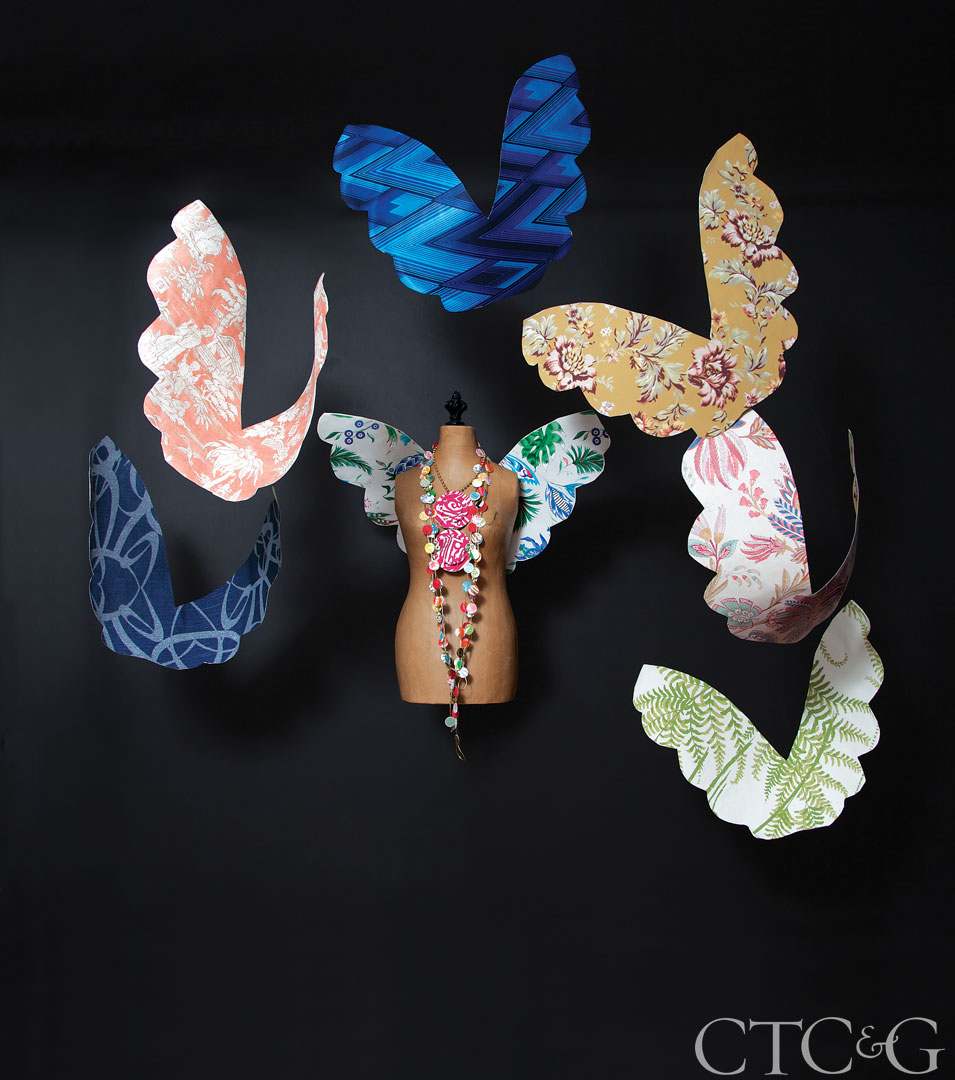 1. Stark’s Glam in Charcoal. 2. Jim Thompson’s the Scarlet Letter collection’s Ylang. 3. Osborne & Little’s Fantasque collection’s Astoria. 4. Sandberg’s Tradition collection’s Rosenholm Dark Yellow. 5. Colefax & Fowler’s Casimir in Red and Blue. 6. Tyler Hall’s Copenhagen collection’s Palace Fernery in Crushed Mint. 7. (necklace) Brunschwig & Fils’ Volume 56 collection’s Bombay Fuchsia in White/Pink; (wings) Matthew Williamson at Osborne & Little’s Cubana Wallpaper collection’s Habanera.