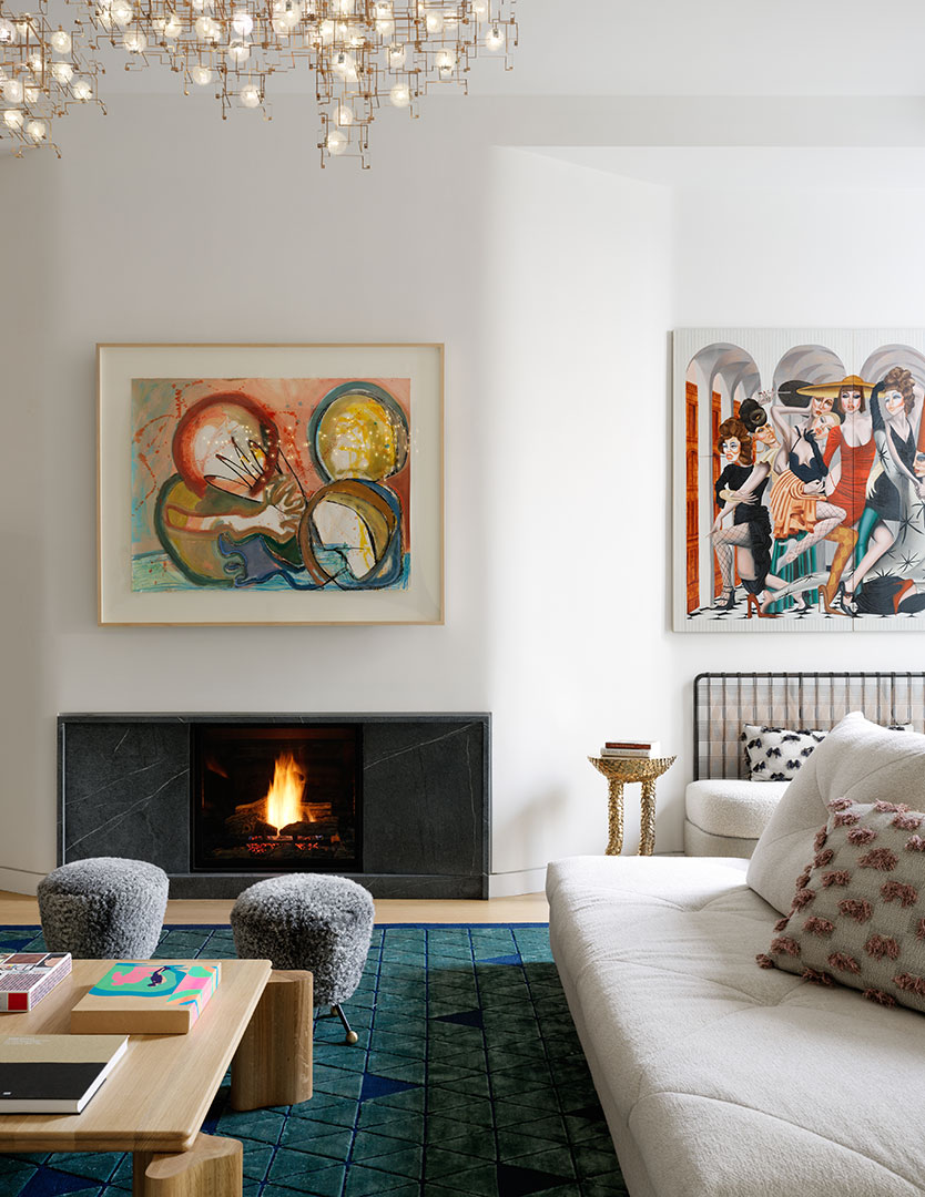 Built in 1910, the townhouse encompasses five bedrooms, three full bathrooms, and one half-bath. A sunken family room is surrounded by walls of glass that open to seamlessly blend the indoors and outdoors. Double-height ceilings in the entertaining spaces allow for light-filled, airy interiors with ample wall space to show off artwork (this couple has plenty of notable pieces, including work by Takashi Murakami). Ascending a sculptural staircase, you come to the home’s private and spacious accomodations. The primary suite occupies the entire third level, while the rest of the bedrooms occupy the fourth floor.