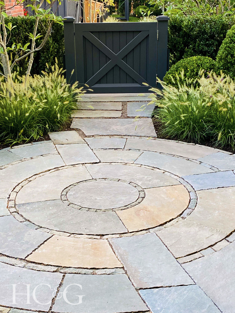Seeking more opportunities to bring friends together on summer evenings for fun and leisure, a young family in a contemporary home chose to expand their outdoor living space. The newest entertainment area, just beyond the pool, is centered on the sociability of gathering around a fire, sharing a bit of food and drink and playing bocce together. A sunken lounge with a fire pit is the heart of this space, inviting a change from poolside activities. Immersed in layers of naturalistic plantings and shaded by Chinese Elm trees, the lounge is tailored and sleek, in keeping with the home’s contemporary aesthetic. A soft, monochromatic planting palette and Madras Grey sandstone keep the space feeling tailored and sleek, yet warm and inviting.