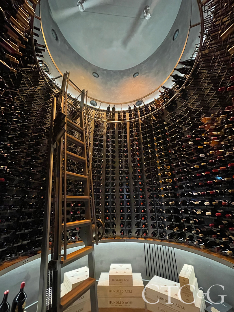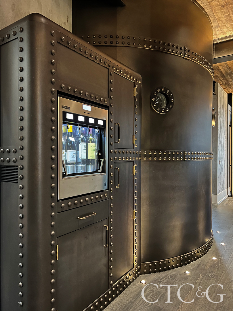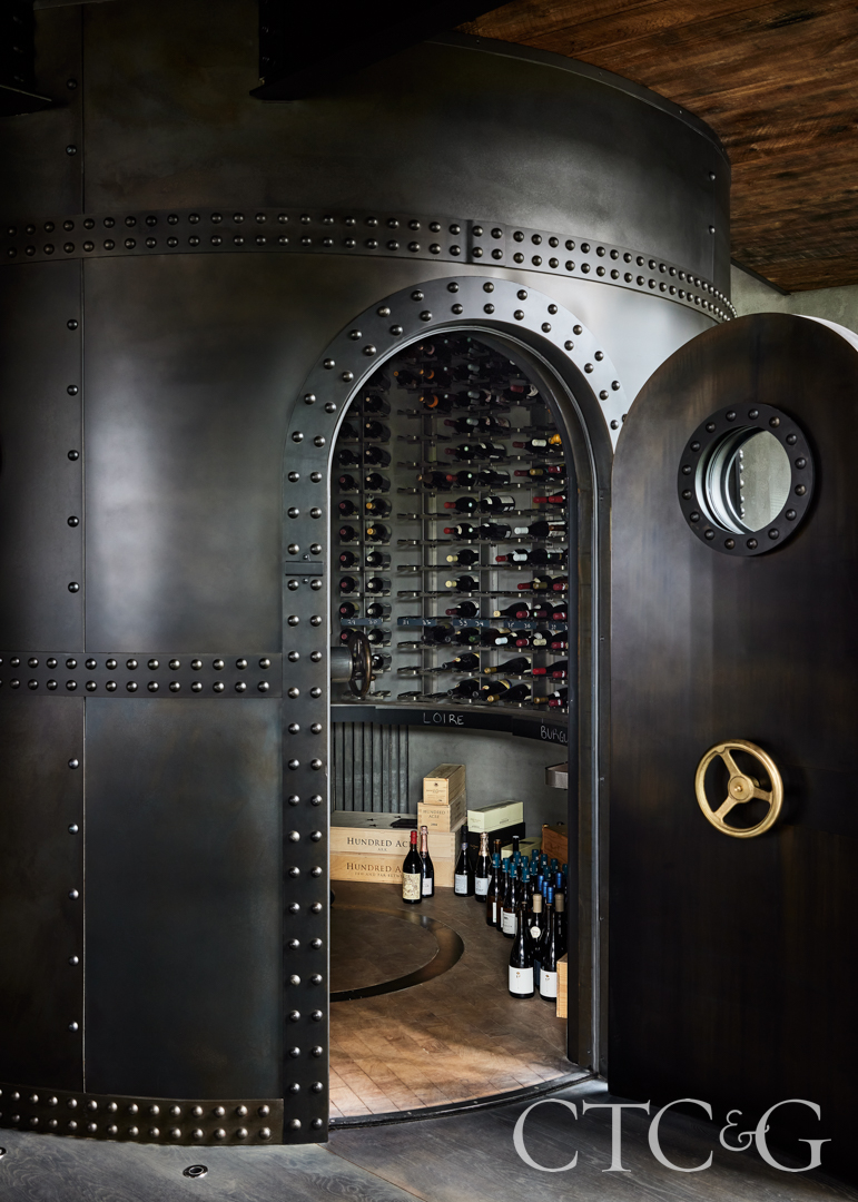 When walking into this residential, restaurant-quality kitchen, visitors find something that looks akin to a surfaced submarine, complete with windowed portholes and a riveted steel exterior. What proudly takes its place in this room is a circular two-story, metal-armored wine silo able to hold 2,000-plus bottles. Upon entering through a fortified, arched doorway, you encounter an 18-foot-high space ringed by a curved steel and bronze wine rack. A custom ladder rotates around the space on a bronze ring track, mortised into a vertical grain, industrial wood block floor. When accessing the upper bottles, a three-bottle funicular-like mechanism allows for bottles at the top to be safely brought down mechanically. Meanwhile, a curved staircase on the outside circles to the silo’s top for a view to the inside, which also includes a sommelier tasting space. Affixed to one end of the structure is a four-bottle wine dispenser and storage for wine accessories. Here, at once, is a whimsical, yet practical architectural element within the architectural envelope of a private home.