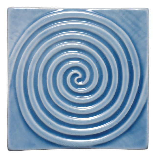 The Twain Spiral Decorative Field Tile from Waterworks’ Vintage Collection is a reproduction of a tile used in homes in the early 20th century. 4’’x 4’’, shown in Azure Blue Glossy Crackle, Greenwich, (203) 869-7766, and Danbury, (203) 546-6265, waterworks.com.