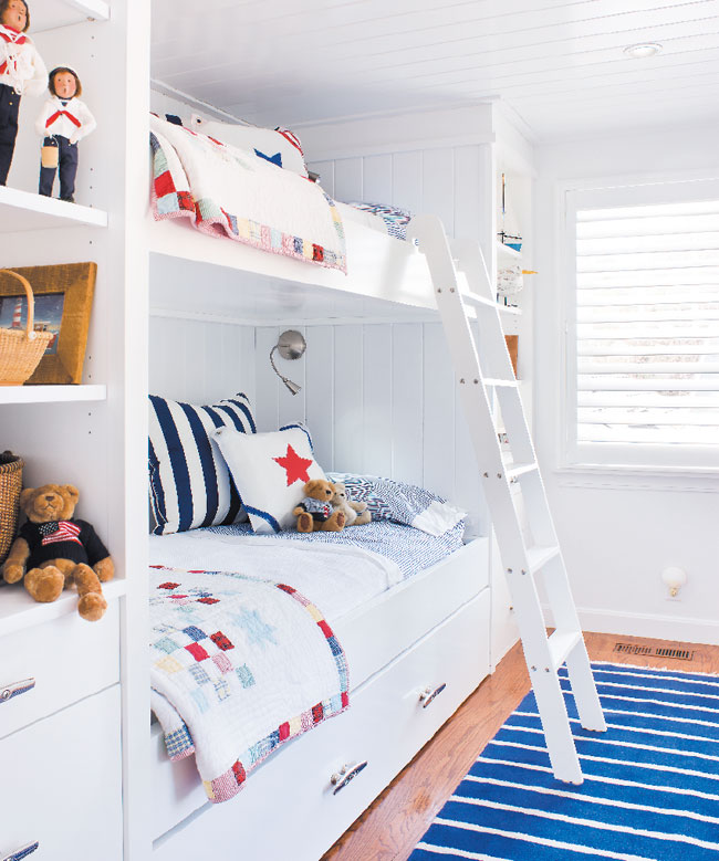 A snug bunkroom sleeps three thanks to the pull-out trundle bed; the blue-and-white striped rug is from Pottery Barn Kids.