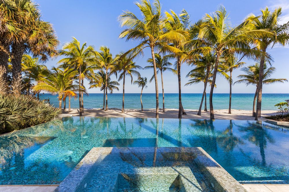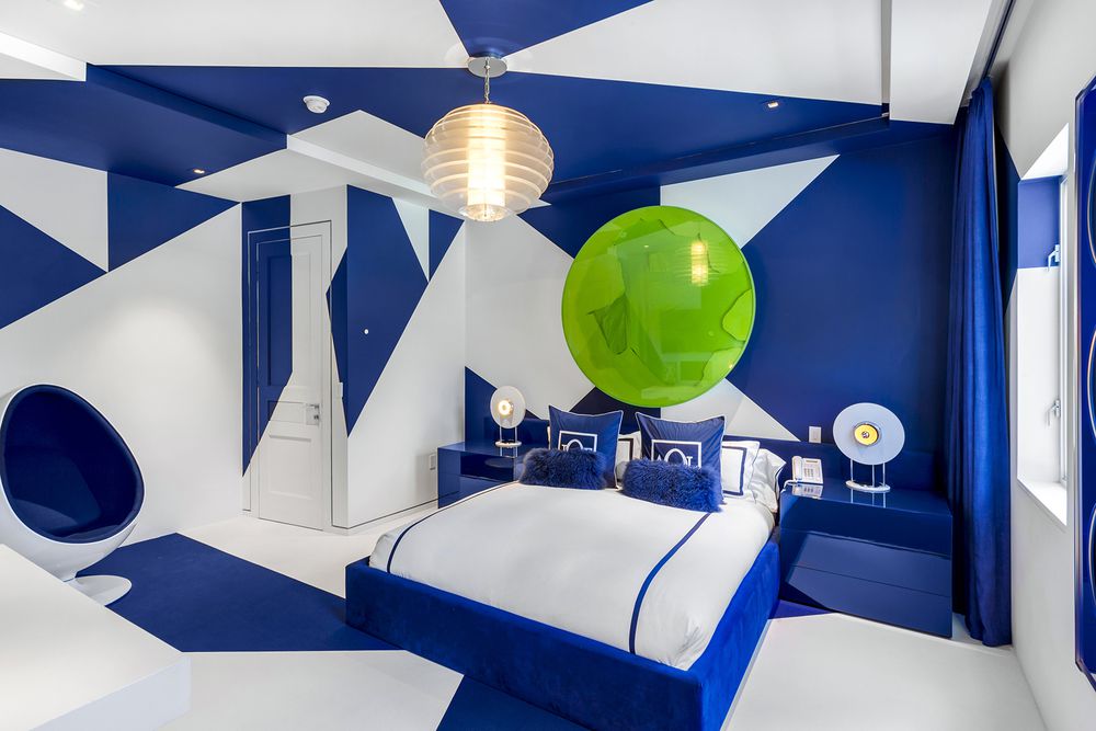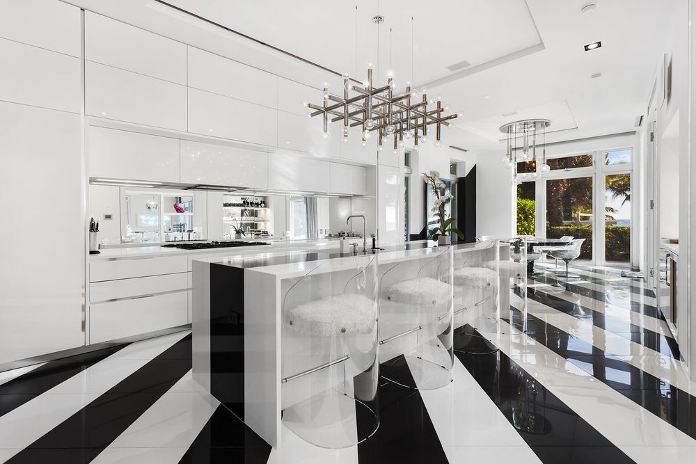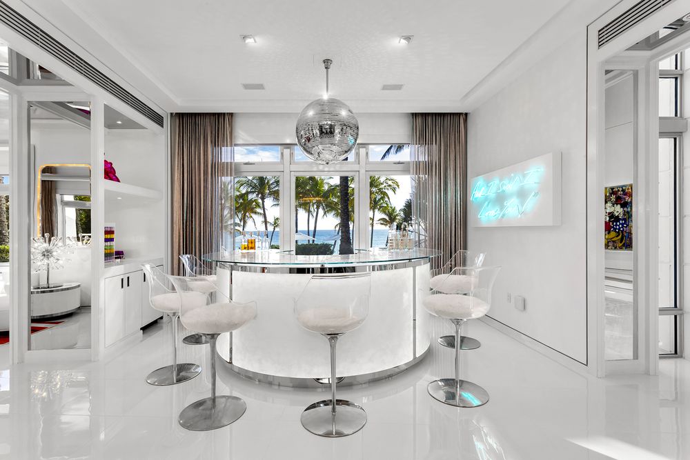 About a year ago, fashion designer Tommy Hilfiger and his wife Dee Ocleppo Hilfiger put their artful Miami beach house on the market for $27.5 million and after no movement, the price has now been reduced to $23.5 million. Located in Golden Beach, the 14,079-square-foot pad boasts 100 feet of glorious ocean frontage, but its groovy interiors are what make it one-of-a-kind.With the help of interior designer Martyn Lawrence Bullard, the Hilfigers created rooms filled with bright colors, bold patterns, pop art, and even scratch-and-sniff fruit wallpaper in some bathrooms. The living room looks straight out of an Austin Powers movie with a fun swirling carpet and retro white couches. A mirror on the ceiling reflects the entire space, making it almost look painted to match the orange, purple, and white color scheme. Black-and-white striped glossy flooring is striking in the gourmet kitchen and contrasts the overwhelming color that exists in other areas of the 7-bedroom home. Outside, a funky sculpture sits next to lounge chairs and an infinity pool, which are just steps away from the sand.Jill Hertzberg and Jill Eber of The Jills have the incredible listing. Curbed first reported the recent price cut.