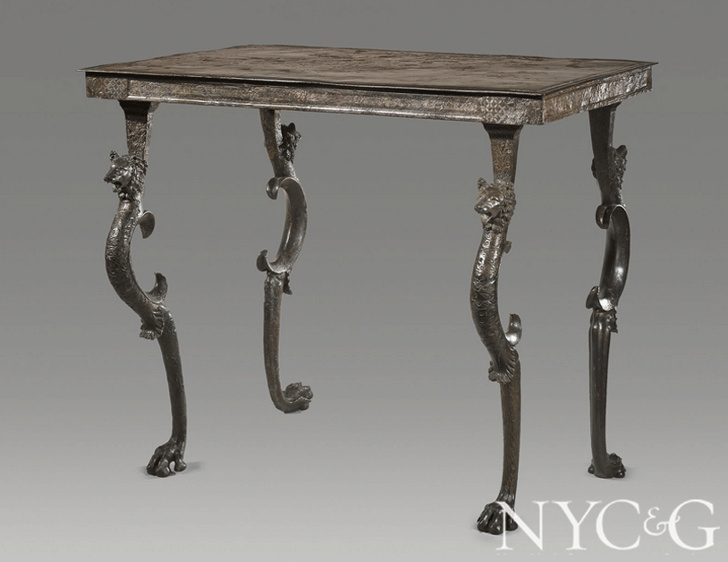 A number of dealers at the fair specialize in ancient art, including Phoenix Ancient Art, which presented this Greco-Roman four- legged table. This rare piece in bronze with silver inlays dates from the 1st century BC to 1st century AD.