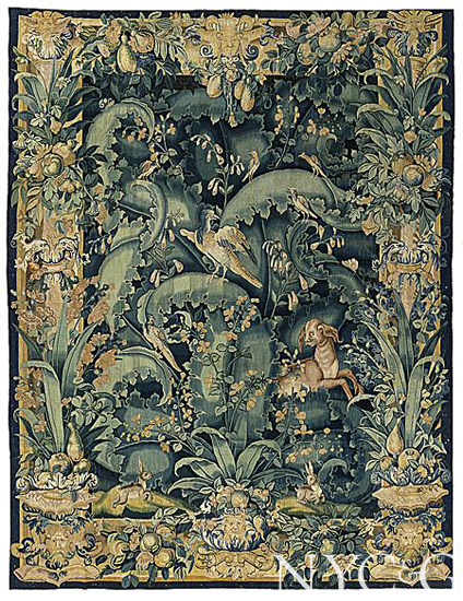 Grand tapestries may be a thing of the past meant to keep drafty stone castles warm in winter. Nowadays they are appreciated for their remarkable artistry. De Wit Fine Tapestries showed an impeccable ‘Feuilles de Choux’ tapestry, which is notable for the rich green colors, which typically fade to blue.