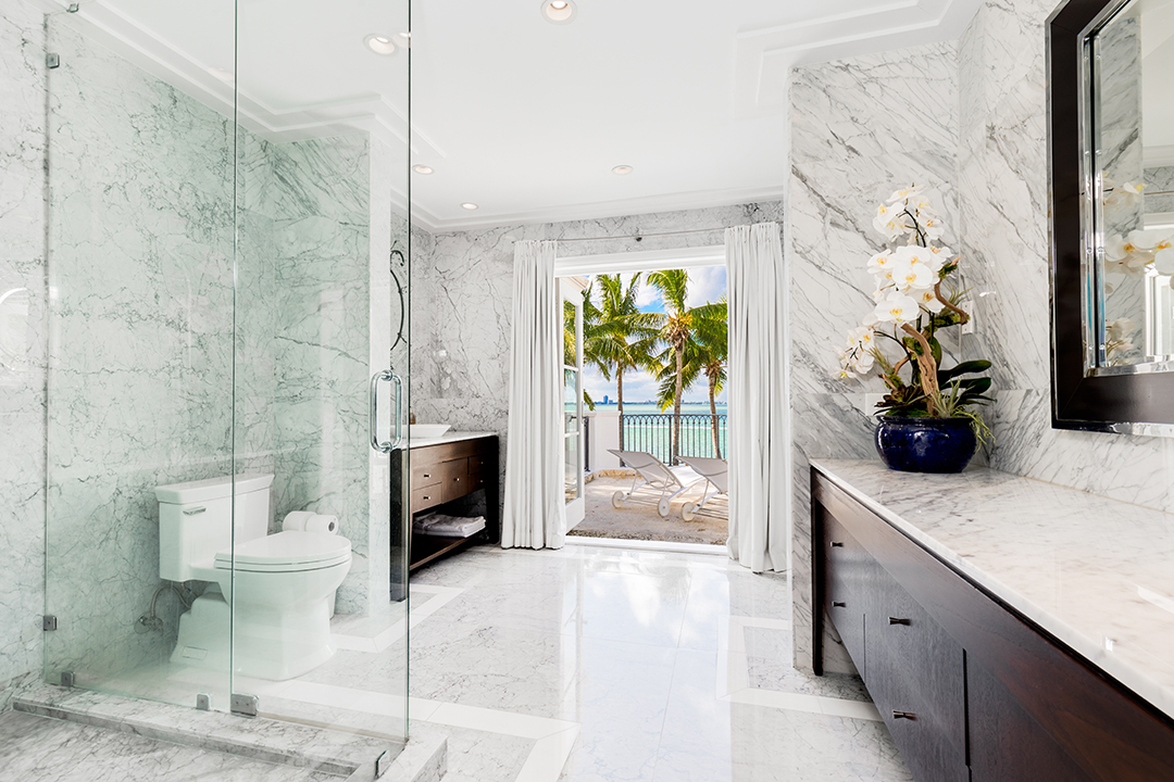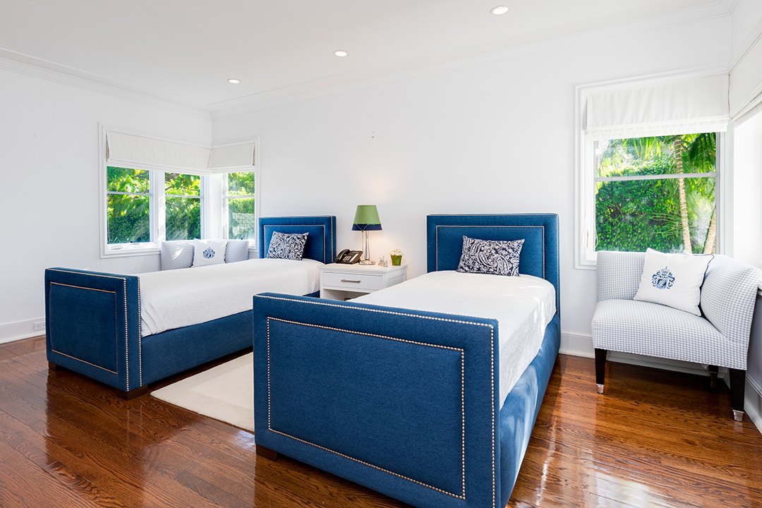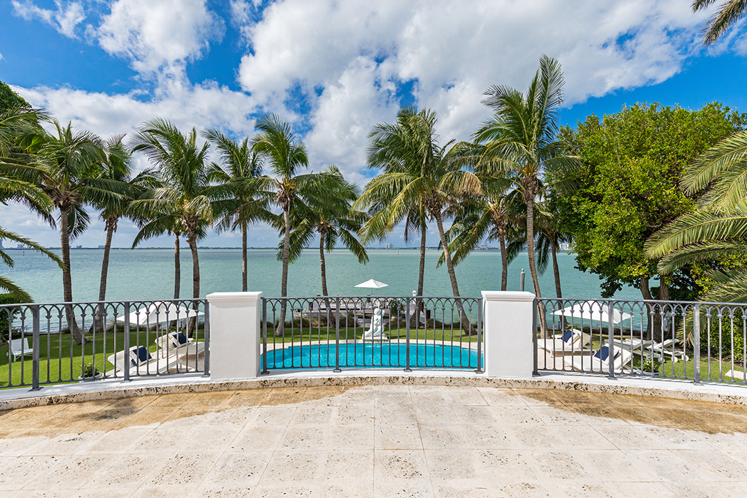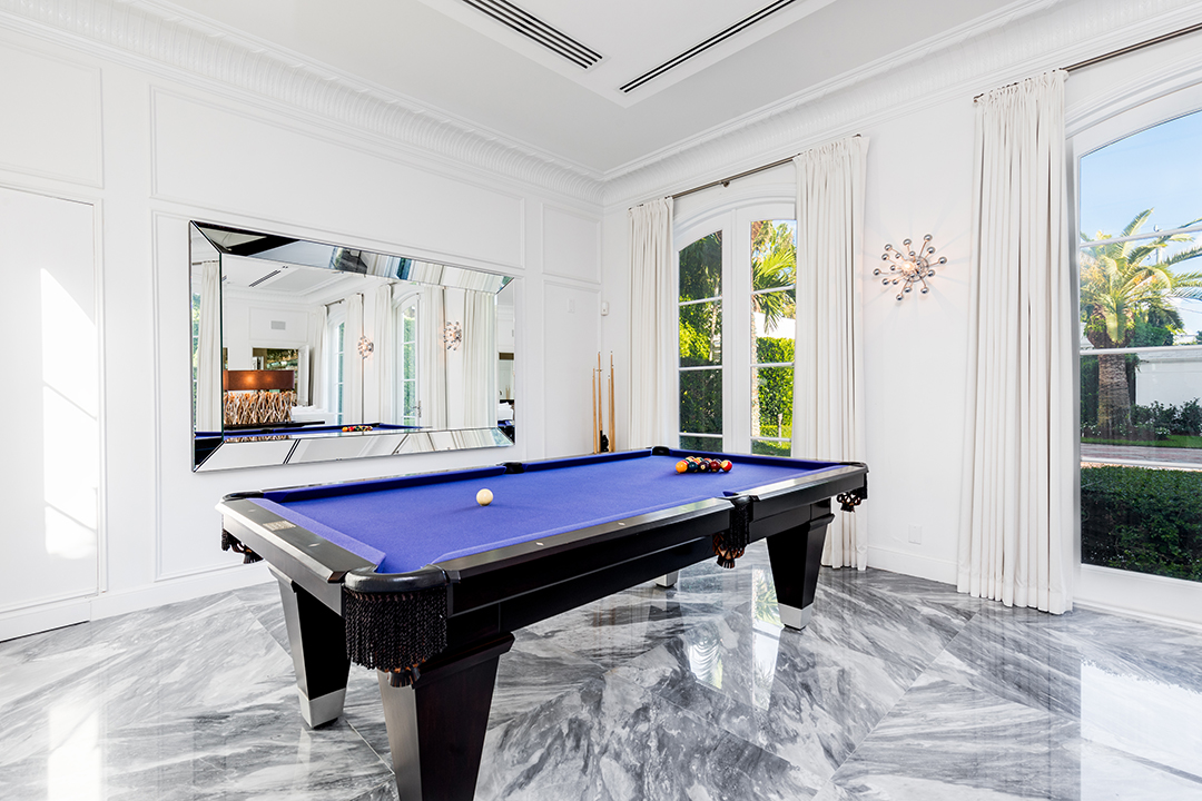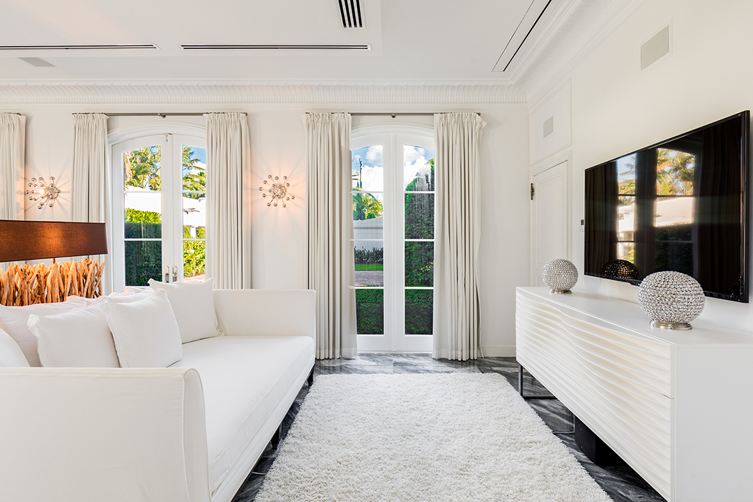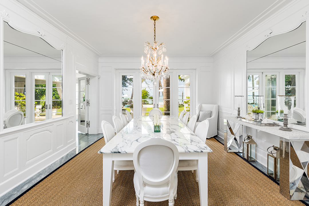 There are ten bedrooms, eleven baths, and two powder rooms spread between the 7,746-square-foot mansion and charming guest home. As the estate was originally built in 1936, interiors pay tribute to Miami’s old glamorous style, however, recent renovations gave it a delightful refresh. Shining with simple elegance, it has bright white walls and chic details throughout.