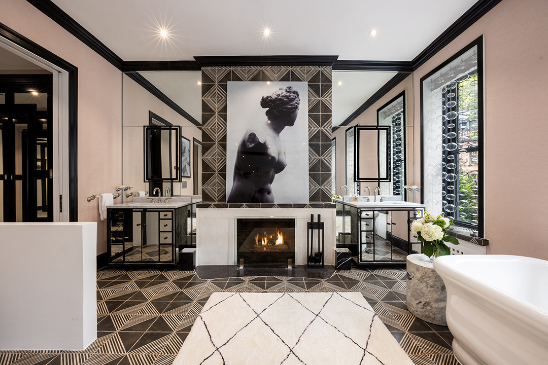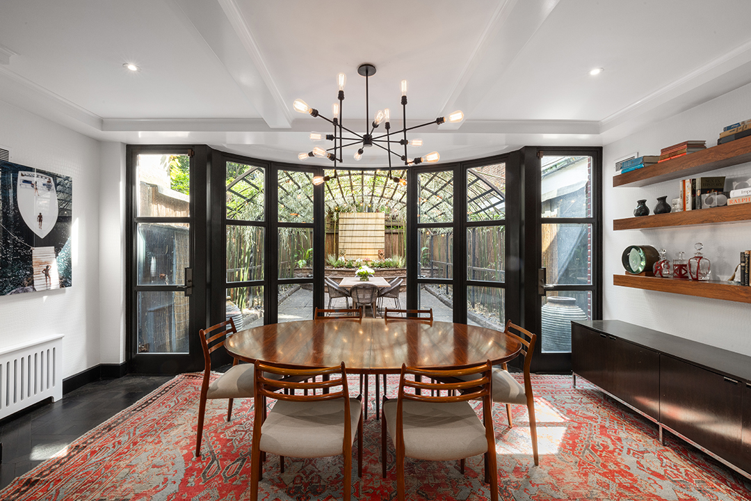 Going back in time, the townhouse was designed by architect John Sexton and completed in 1871. Recent renovations have helped give it fresh panache and modern conveniences, of course. Today, there’s an art deco vibe in the main living spaces thanks to the art that decorates the walls and graphic patterns weaved all around.