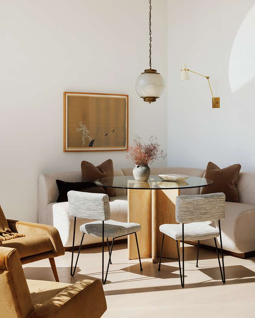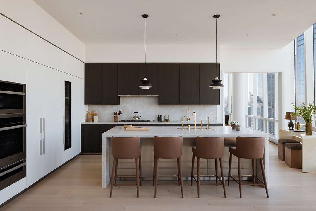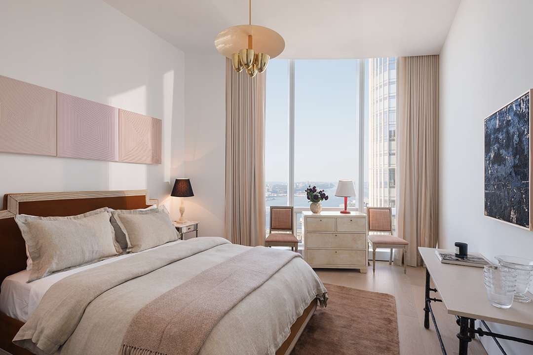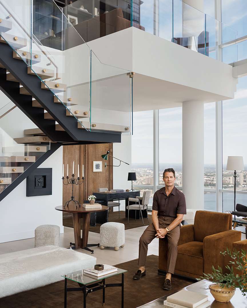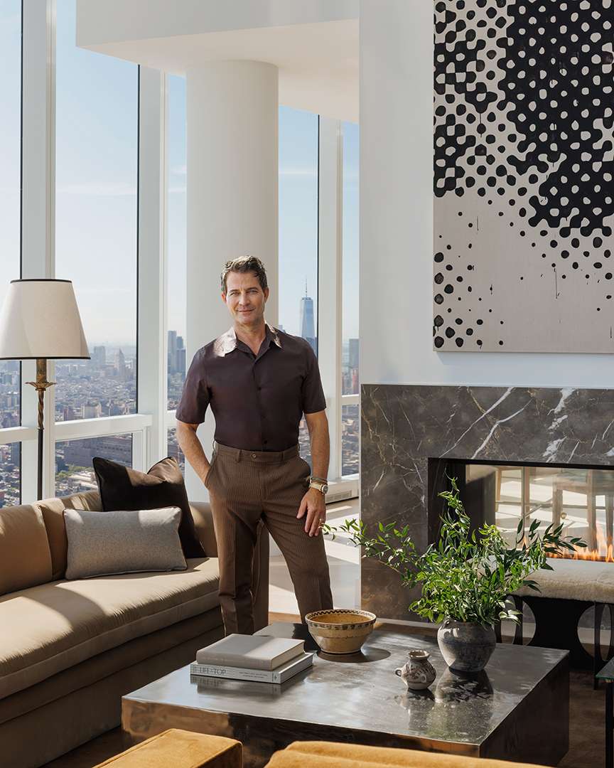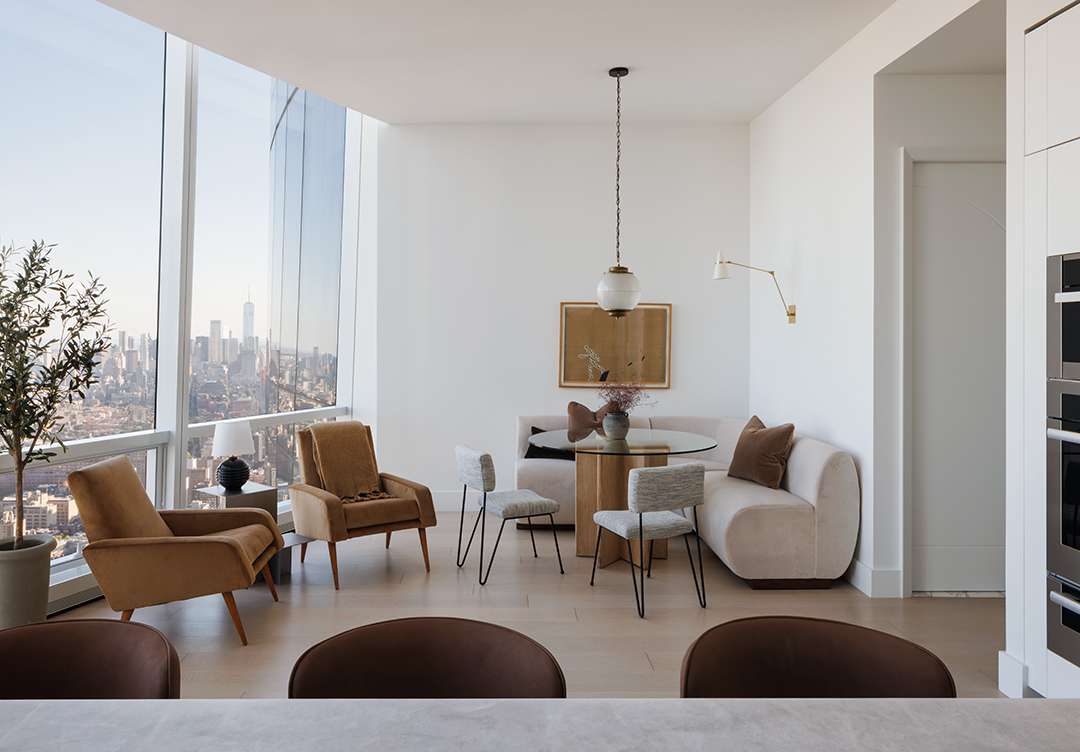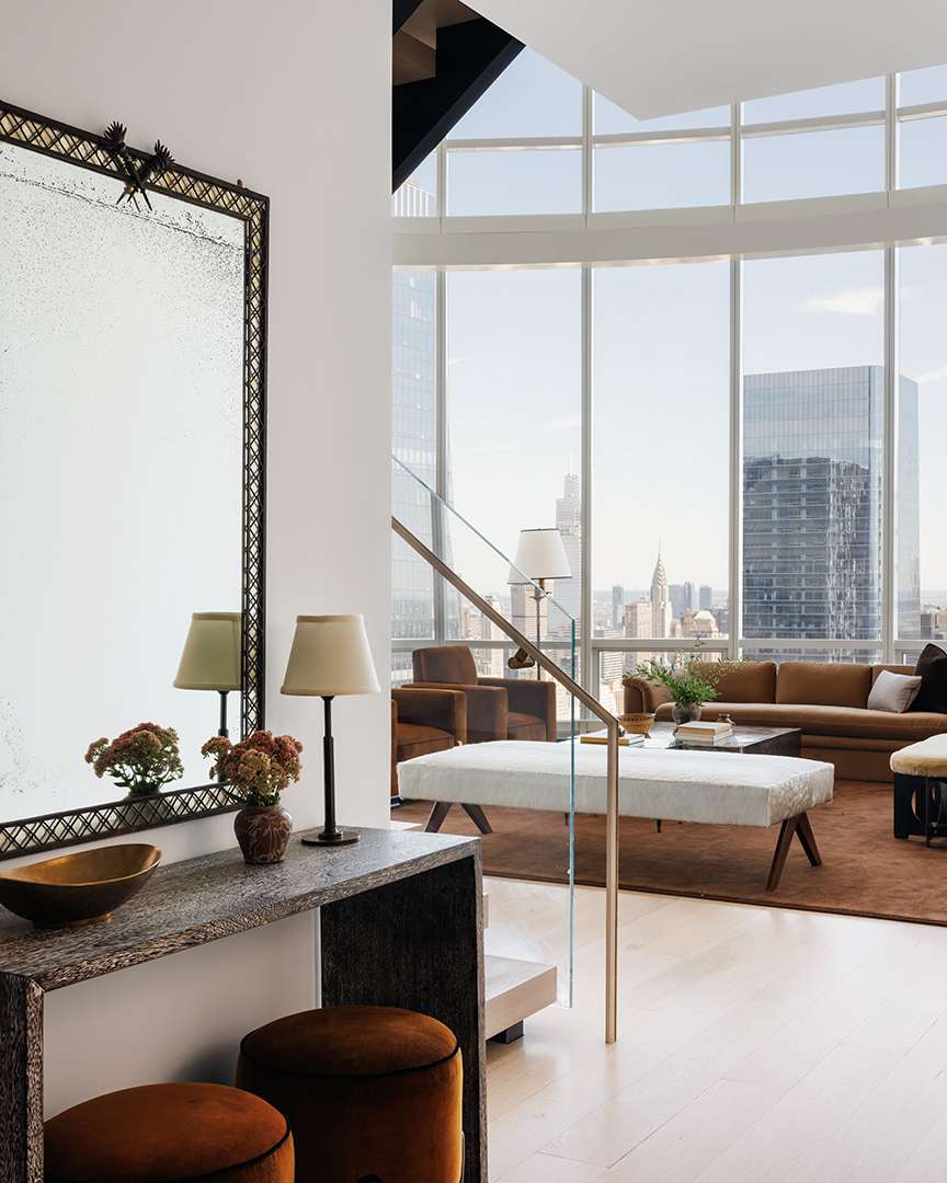 Extending 5,139 square feet, the posh NYC home holds 4 bedrooms and 6.5 baths and fosters a strong connection to the sky-high setting and city around you. Berkus muses, “The first thing that struck me when designing the penthouse was how the natural light moves throughout the space—the mood completely shifts depending on the time of day. I leaned into that by incorporating architectural details and materials that interact with the light—so when the sun hits a patterned rug or grazes the curve of a chair, it feels thoughtful, and handsome. Being so high up, the apartment is almost suspended in the sky, and I wanted the design to reflect that. A soft, tonal palette enhances that sense of expansiveness, while still grounding the space and making it feel lived-in and inviting.”
