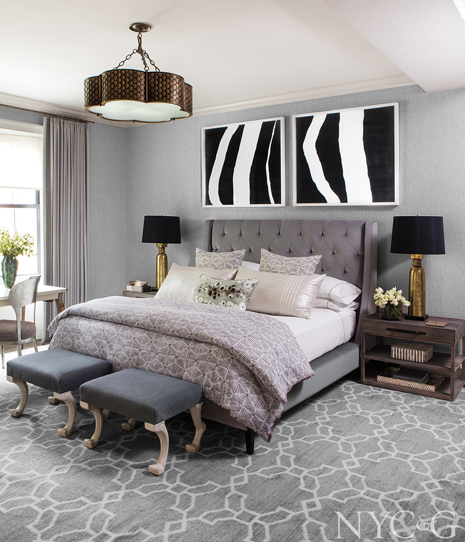 The palette of the apartment is essentially “neutral,” but the neutrality is deceptive. The serene master bedroom, for example, is a symphony of blues, grays, browns, and pale lilac with tonalities ranging from white and ivory to charcoal and black. Because his clients wanted their home to be “simple and unfussy,” Filicia reports, he introduced subtle patterns “to give the space some visual depth. Layering always enlivens a room.”