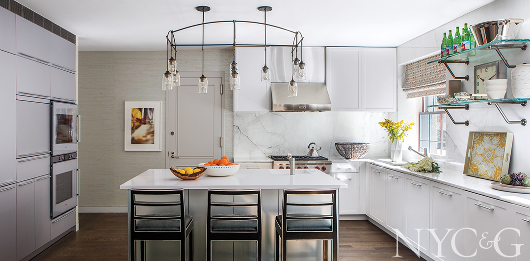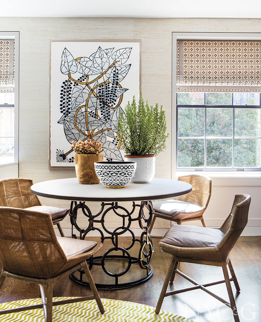 The kitchen and family room, cobbled together from a hodgepodge of small spaces that were part of the original prewar layout, “is a space for family to enjoy informal meals or watch TV or bake cookies—whatever they want to do,” Filicia says. And it was designed so that the kids can feel at home there, without having to worry about fabrics and finishes. “The sofa is beautiful, but it’s covered in an indoor/outdoor fabric, so it’s totally cleanable.”