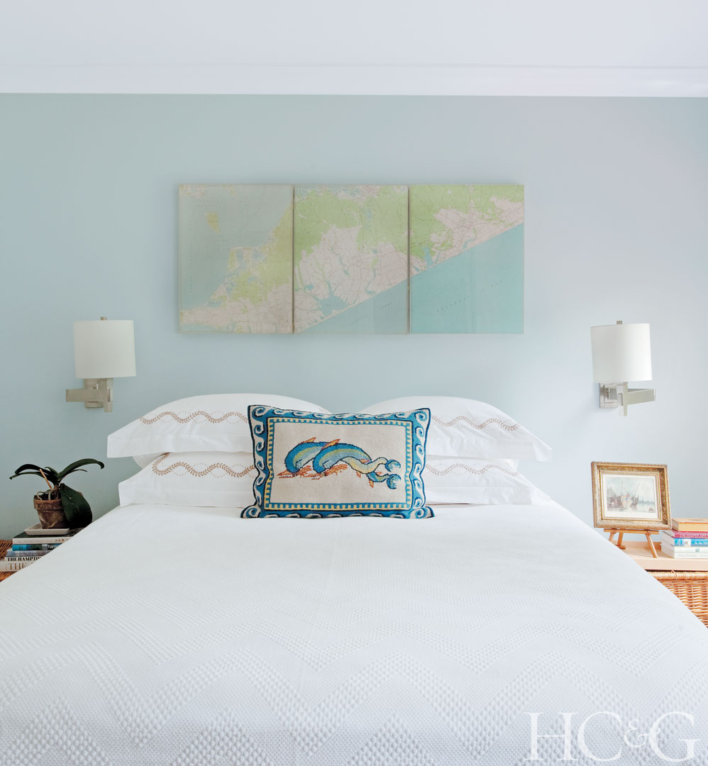 In the master bedroom, a custom headboard and cotton-piqué coverlet are soft foils to an impressive antique Chinese hardware chest.