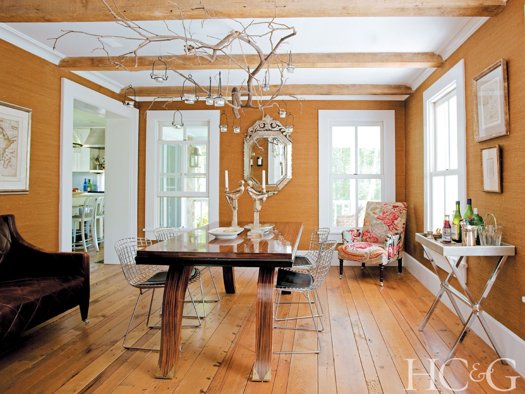 A quartet of chrome Harry Bertoia chairs surrounds an Art Deco zebrawood dining table. The library chair in the corner is covered with a Moldovian floral kilim.
