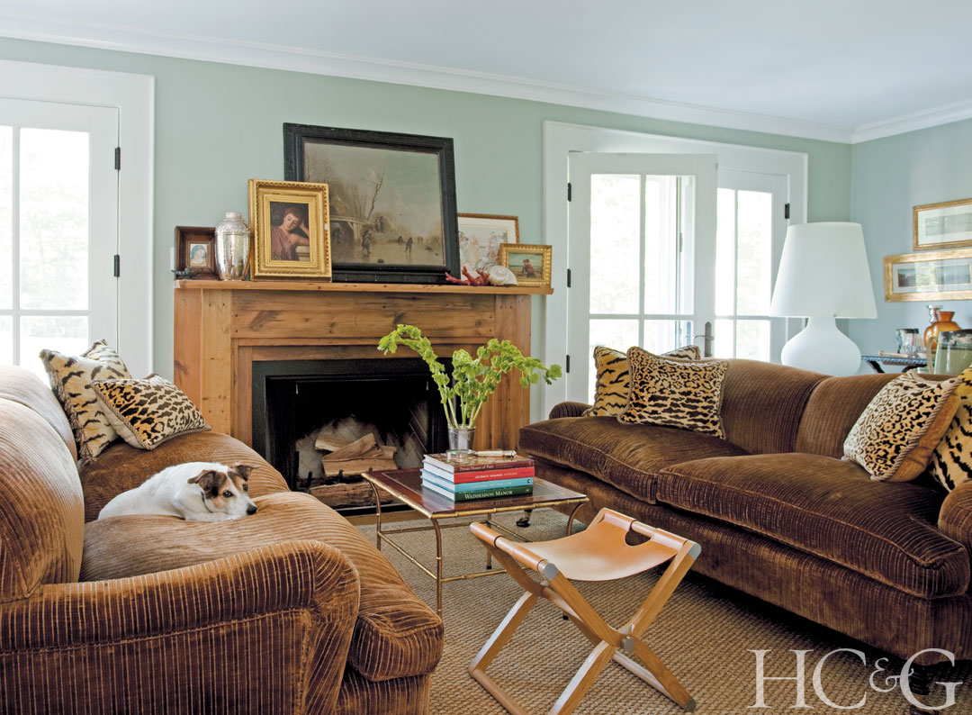 In the TV room, the hand-colored leather Chesterfield sofa is roomy enough for four; a pair of Manolo slipper chairs flanks a hand-colored leather side table.