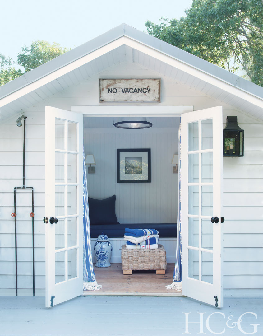 Designed to mimic the main residence, the charming pool house features a similar steel beam roof in lieu of traditional shingles. The “No Vacancy” sign is a find from a local flower shop.