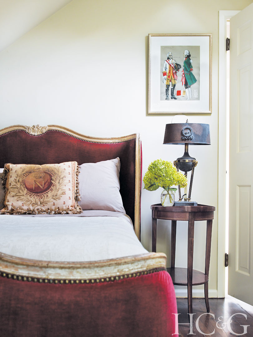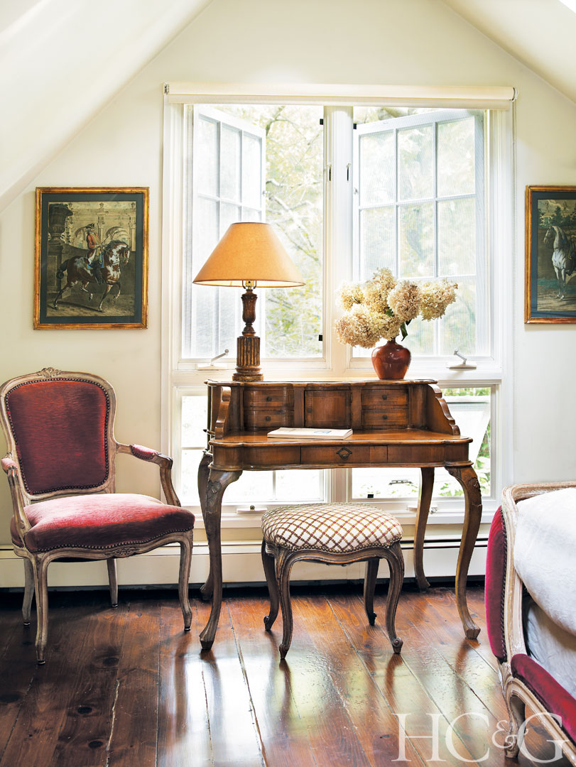 In a guest bedroom, an antique Italian writing desk sits between a Louis XV–style armchair and a Louis XV French bed.