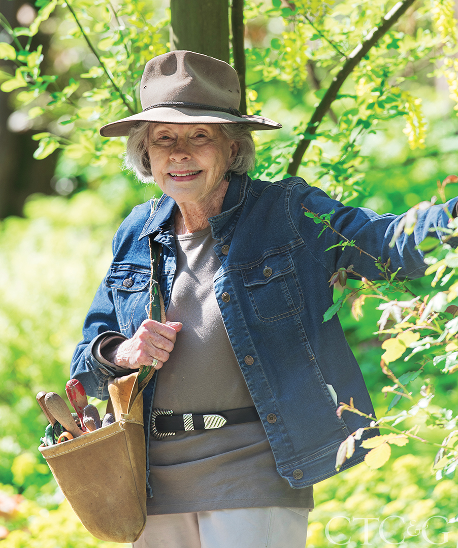 Mary Stambaugh is invariably toting a rucksack of garden tools.