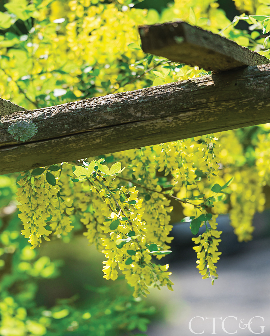 The golden rain vine (Laburnum anagyroides) drips from a pergola.