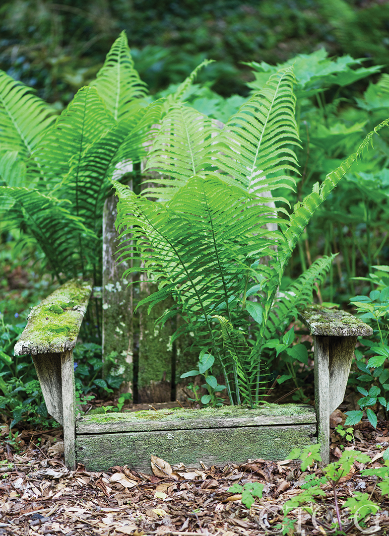 Ostrich ferns commandeer a collapsed Adirondack chair.