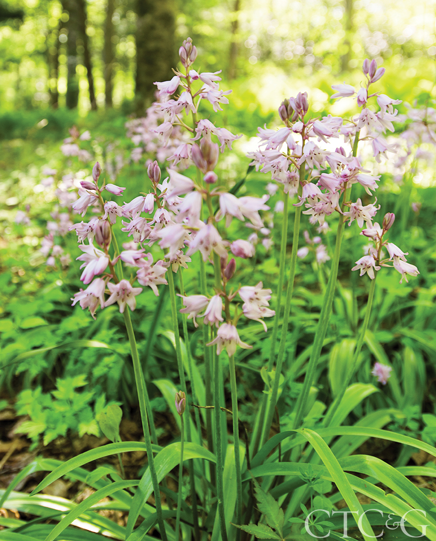 Pink Spanish bluebells (Hyacinthoides hispanica) accent the bulb meadow.