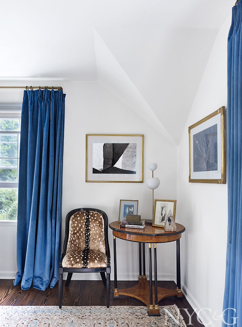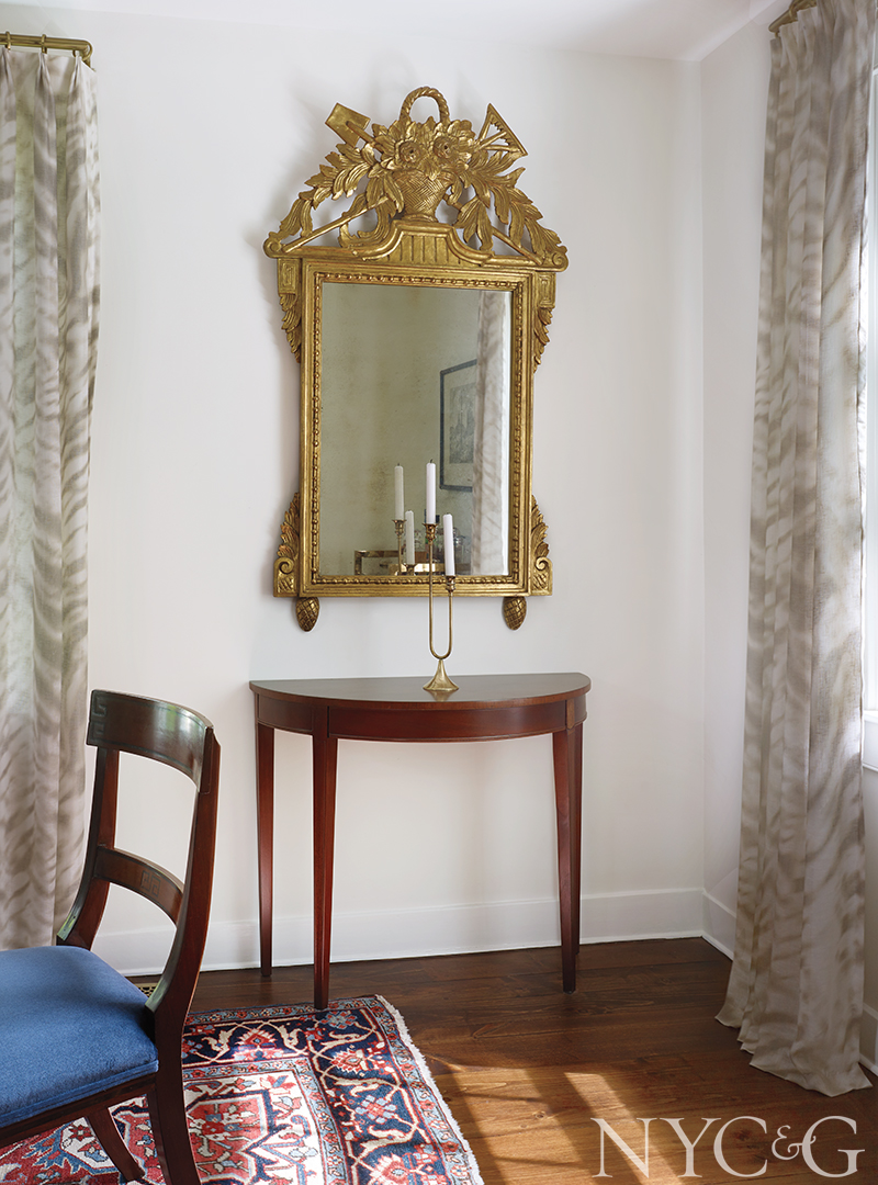 References to MacMurray’s own childhood, much of it spent abroad, appear in abundance. Before attending high school in Connecticut, the designer spent her formative years in Mexico, Colombia, and Sweden, where she immersed herself in each country’s design culture, observing craftspeople at work in Mexico and Colombia and frequenting auction houses in Sweden with her furniture-loving mother. “My upbringing has helped define the direction I take when choosing furniture,” she says, “especially in my own home.” She bought pairs of ornately carved gilt-wood mirrors for the dining room and 19th-century French demi-lune tables, the bases of which are inspired by dragon heads, for the living room—all because her mother owned similar pieces. And she occasionally surprised herself, such as when she decided to buy the bold red and blue Persian rugs that now grace many floors. “I remember shopping for Persians with my mother and swearing I would never use them in my own home—and look at me now!”
