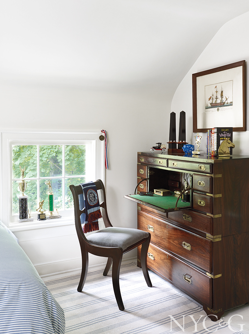 MacMurray acquired almost all the cottage’s furnishings over the course of a year, scouring antiques stores near and far, and even got her children, Mac and Adele, in on the fun. Mac spotted the rosewood campaign chest that now sits in his bedroom while he and MacMurray were shopping upstate in Hudson. And the designer sourced berry-colored fabrics for Adele’s canopy bed during a mother-daughter excursion to the D&D Building. Adele’s room also includes a Swedish dressing table, a piece MacMurray had helped her mother bid on when she was a mere 11 years old.