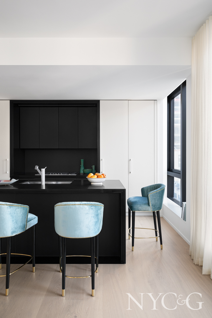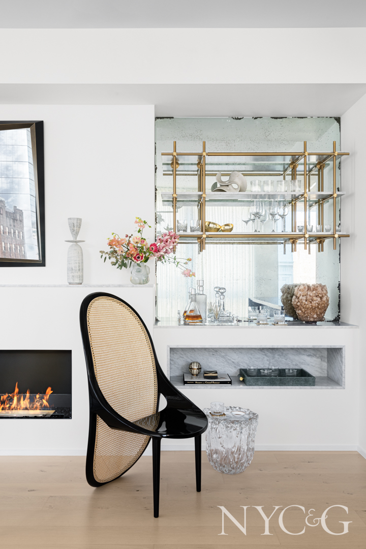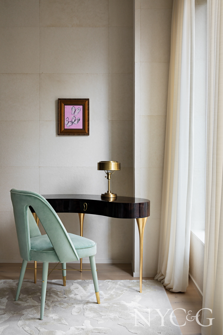 Given that the apartment tower’s mastermind is the renowned Dutch architect Koolhaas, Curry didn’t see a need to make drastic changes to the interior architecture, save for a few details. “I was excited to work here,” she says. “I’m a big fan of Rem Koolhaas and the lines of the architecture, which references Cubism. In particular, there is a great corner featuring interlocking windows in the living room, so we aimed to maintain the integrity of the space while also softening some of the hard angles, introducing curved shapes and whimsical details, as well as a sense of flow and symmetry.” The sinuous custom sofa, for instance, was designed to accommodate, rather than hide, a structural column, while a fireplace flanked by brass floating shelves adds further balance and harmony. “I love the juxtaposition of the angled corner windows and the orderly sitting area,” the designer enthuses. “Curvy pieces make the home feel soft, inviting, and livable.” Anchoring everything is a custom rug conceived by artist and designer Fernando Mastrangelo for Edward Fields Carpet Makers. “It’s one of the first items we selected for the apartment, and it really drove the design,” Curry says. “The pattern reminds me of water and feels very calming.”