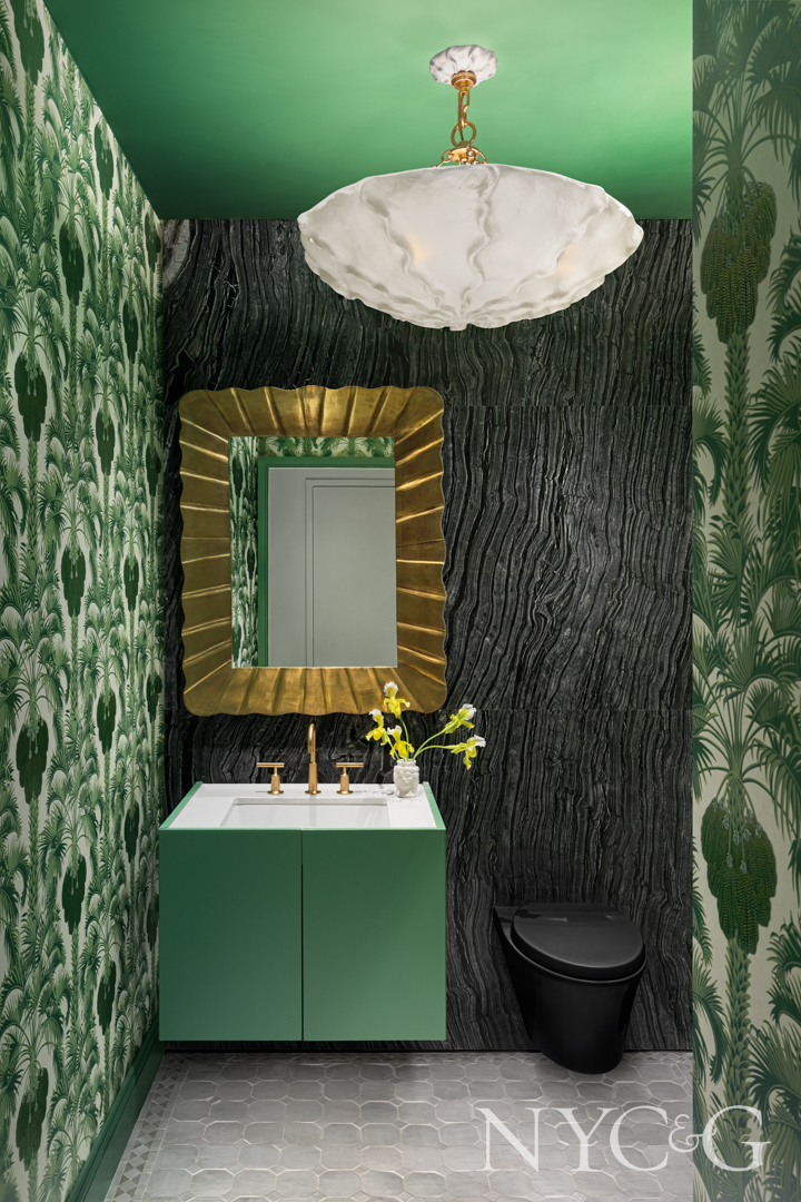 While the living room posed certain design restrictions because of its architecture, Curry was allowed full-tilt freedom in the powder room, often every decorator’s best friend. “Powder rooms are meant to be jewel boxes, so we took the opportunity to do something fun,” says Curry, who opted for a shimmery green and black palette comprising botanical-print wallpaper and a strikingly veined stone.