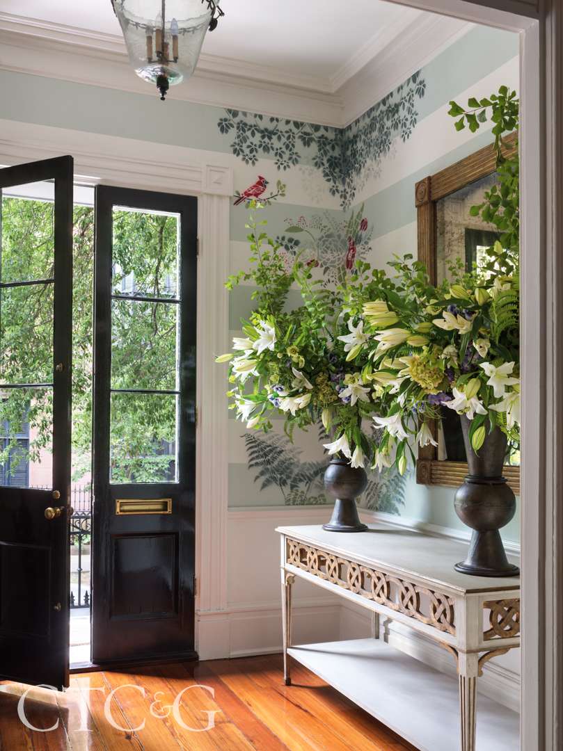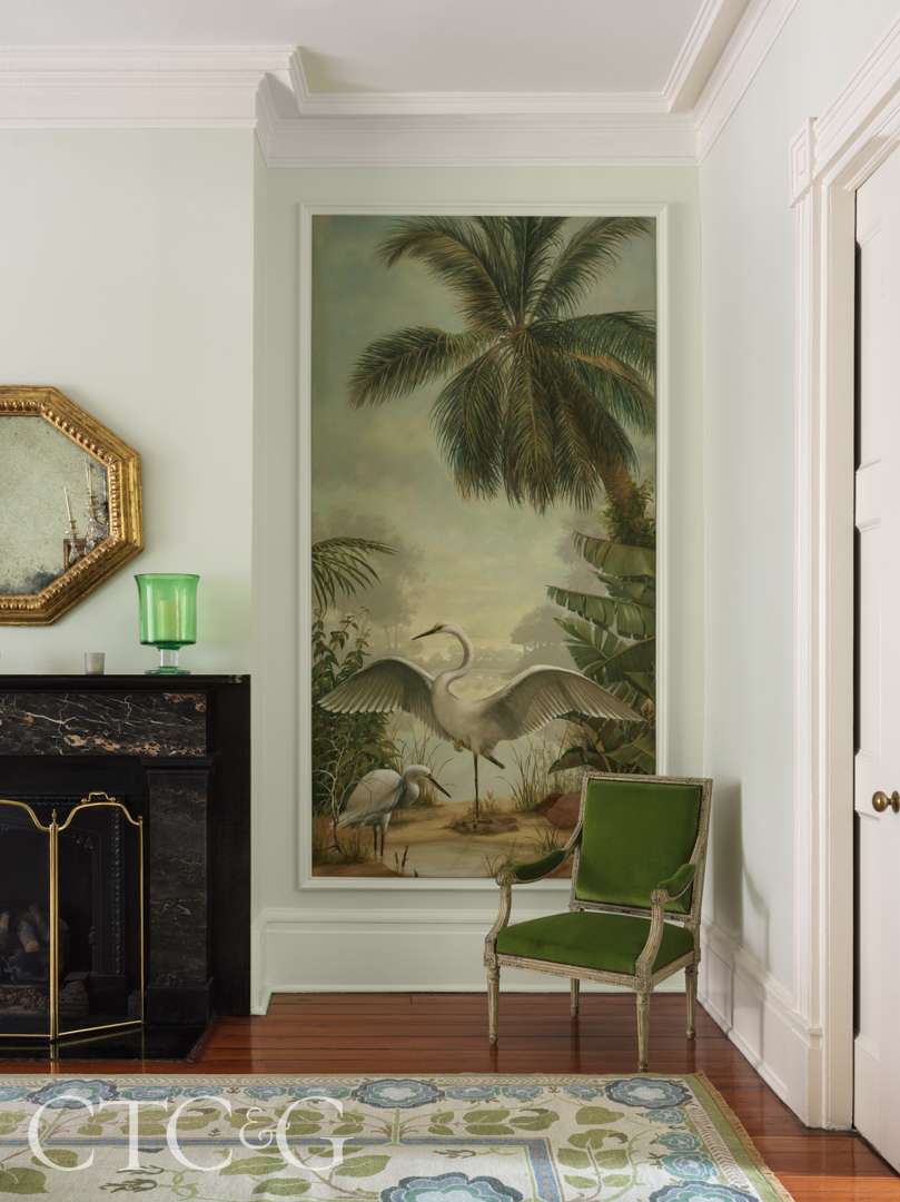 The homeowner also adopted Morgan’s penchant for stripes, evident at the foyer. Vanessa Platacis, a Savannah artist, was commissioned to stencil greenery amid the striping. “I have always loved Vanessa’s work, and so we decided to have her come in and paint the foliage, with birds.”
