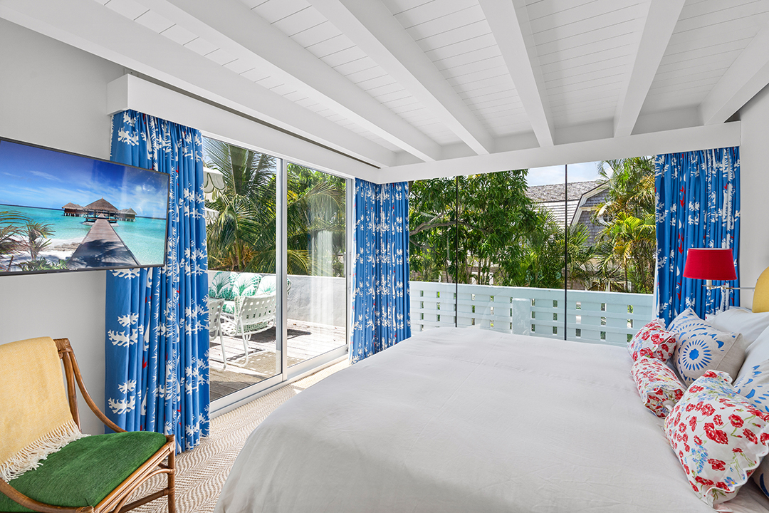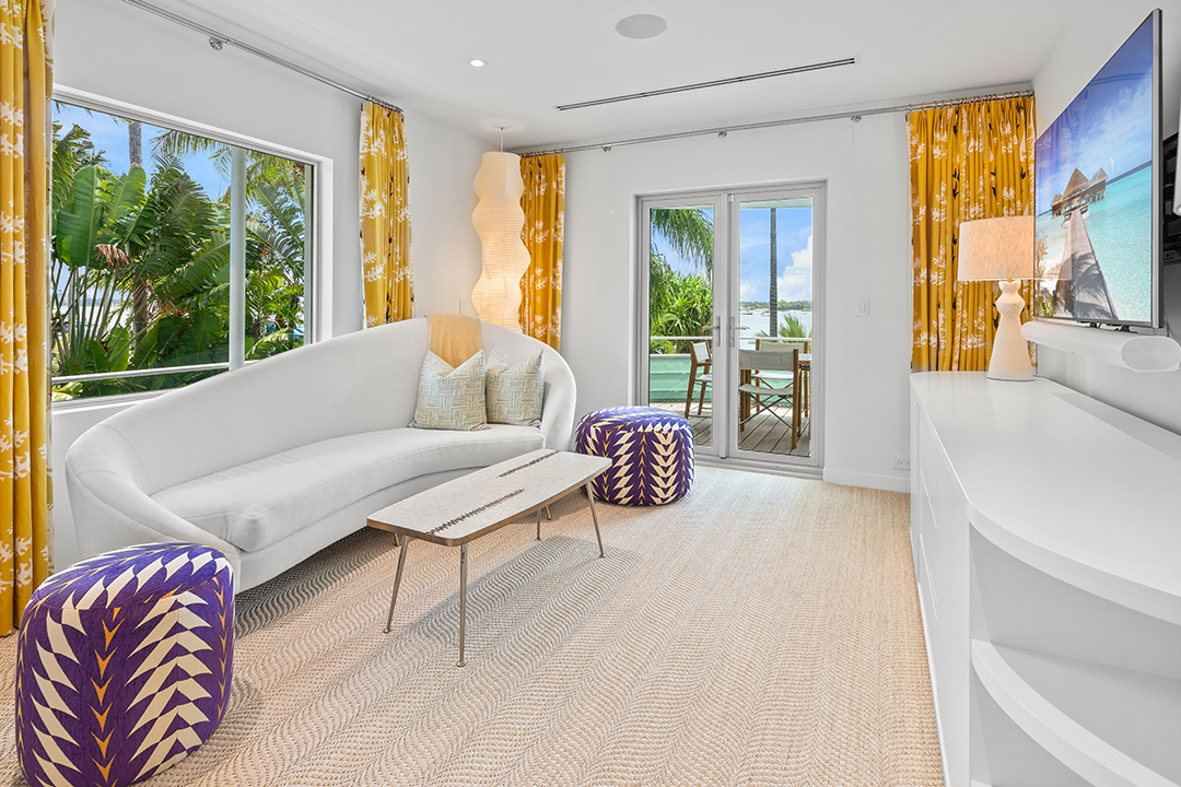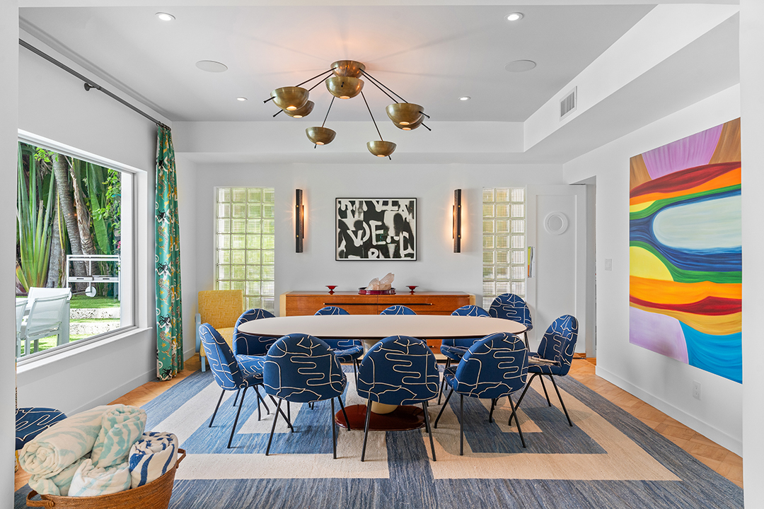 Perched off the mainland on Lake Way, the Boat House is a stunning piece of architecture with many features not seen in today’s new builds. Made of stucco with crawling ivy up the exterior walls, the entryway is only the beginning of the magic that awaits here. Rounded walls and lots of windows help to light up every room of the Art Moderne abode, while the current colorful and graphic decor provides exuberant pops of color throughout.