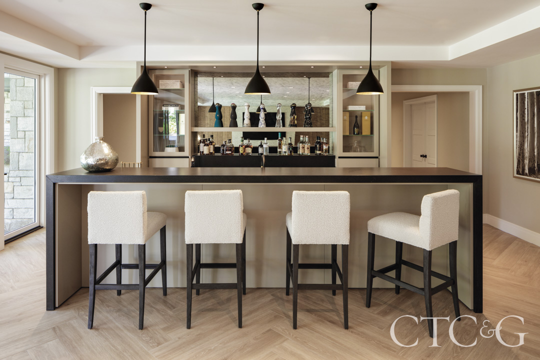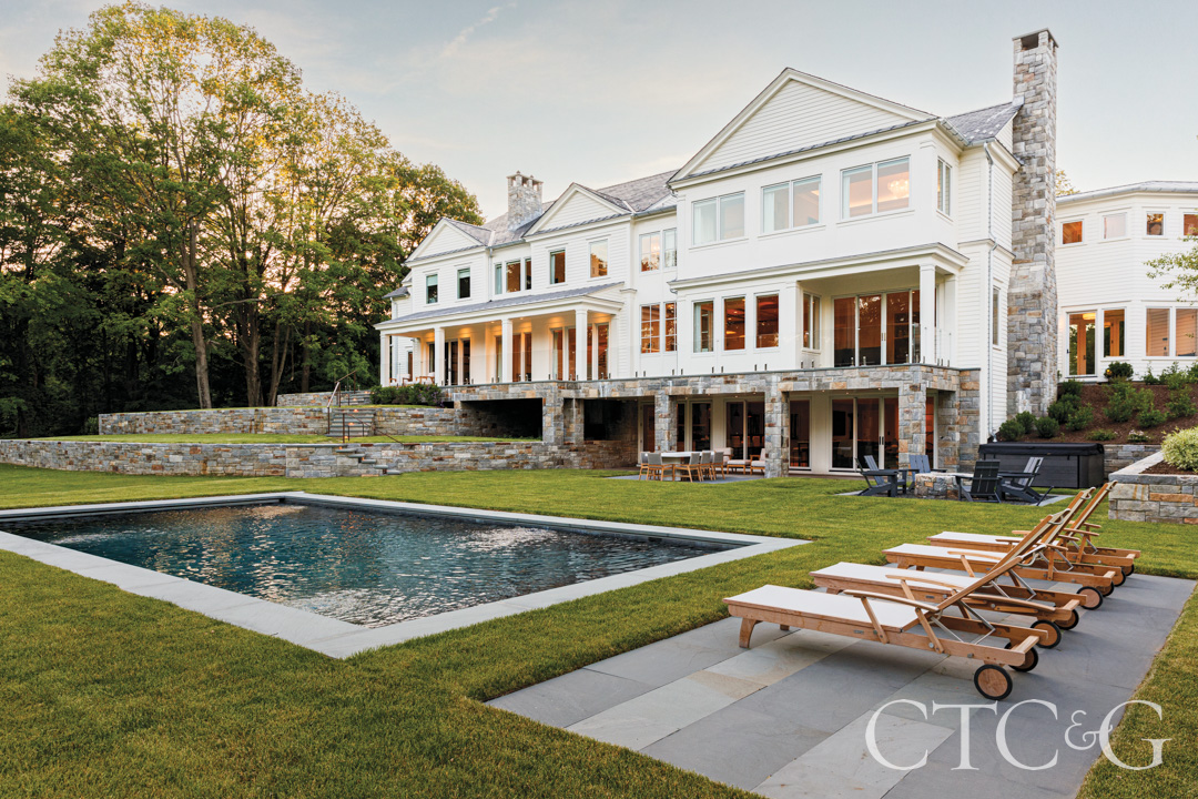 The lower level is devoted to leisure and togetherness—a gym, bar, pool table and game room, plus an expansive media area for watching sports. At the rear of the house, this floor opens directly to the pool terrace and the descending landscape, where the eye is drawn toward the water. “It’s a family that’s very much about family,” says Hummell. And the house—in both plan and spirit—is built to hold them.