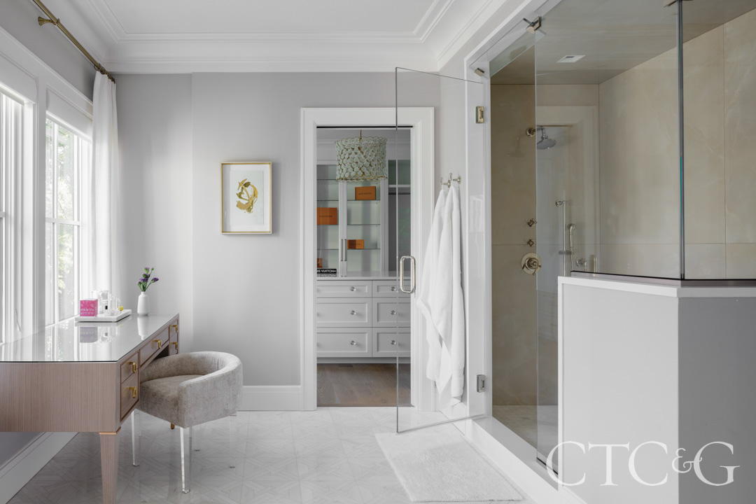 Upstairs are three bedrooms and a nanny’s suite. The primary bedroom includes separate his-and-hers bathrooms, along with the wife’s office—a relaxed space with comfortable seating and generous views.