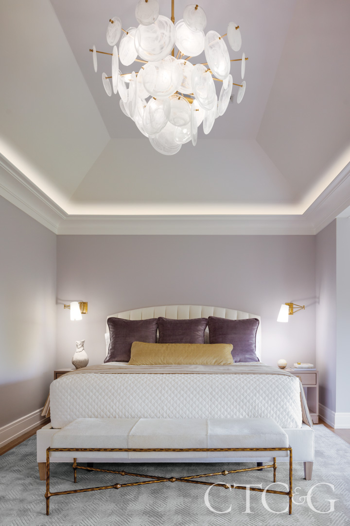 Interior design is by Angie Hummell and Vicki Butz of Nesting Place Interiors. “The clients wanted a modern Versailles,” Hummell says, describing a palette of French-inspired richness—velvets, plus romantic shades of lavender, purple and mulberry. Yet their tastes lean minimalist. The main bedroom pairs simple white linen curtains with a custom headboard, washed-lavender walls, a statement chandelier and a bespoke white cowhide bench. A seating area to one side frames, naturally, more views.