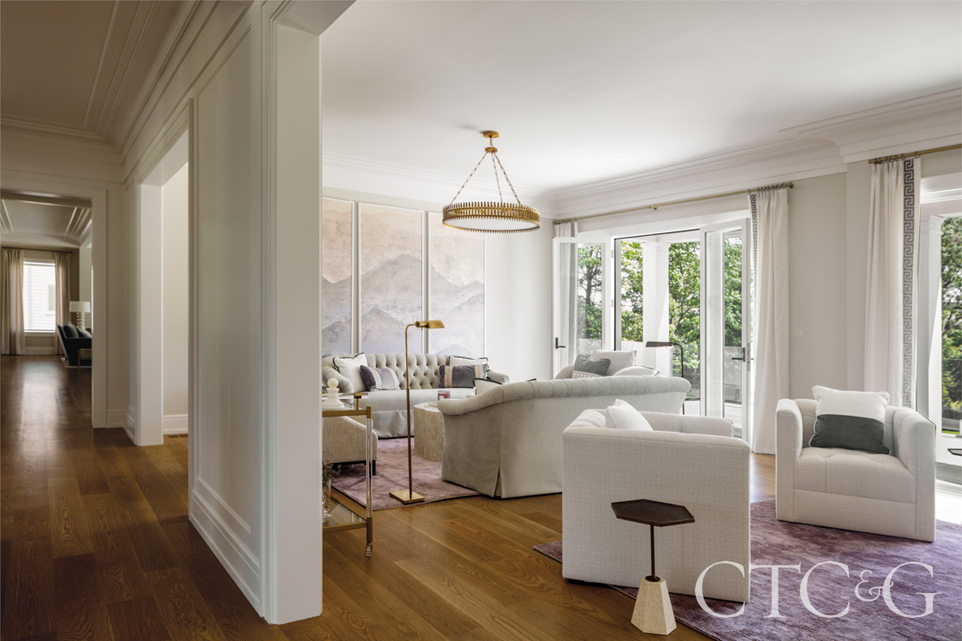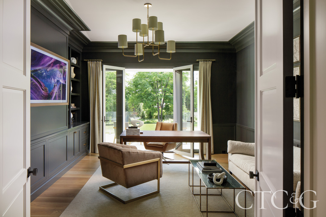 There are two primary points of entry, each setting a distinct tone. Guests arriving at the front portico step into a grand entry with a stained white-oak floor in a herringbone pattern, with living rooms, a study and the kitchen radiating off the hall. In these high-ceilinged spaces, broad white expanses are enhanced by floor-to-ceiling wood panels, and oversized moldings and baseboards, which introduce shadow, texture and depth. “The panels shine,” Kaehler says, noting that the gloss finish signals: this is important.