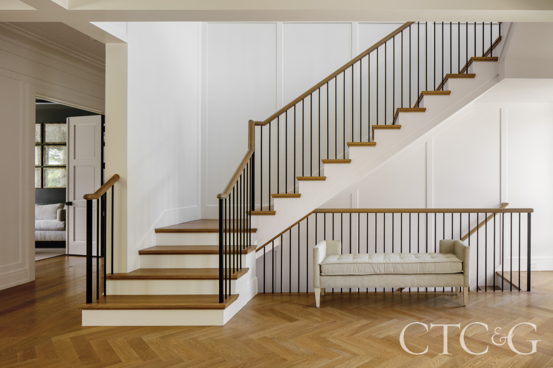The second entrance is more informal—and more frequently used. The garage sits off to the far left on an angle, deliberately kept from becoming a visual focal point. It connects to the main house through a tiled mudroom, which also opens to the front driveway. Between the mudroom and the main living areas, a monumental custom back stair takes center stage, designed to look as light as possible, with slender black balustrades and an oak handrail. “The actual treads are on a slight angle to look like a folded ribbon,” notes the architect. The stairs float up two stories behind an exterior wall of nine large Marvin windows, an area expressed on the façade by a triangular pediment and bump out. Far from a secondary route, the stair reads as its own sculptural space.