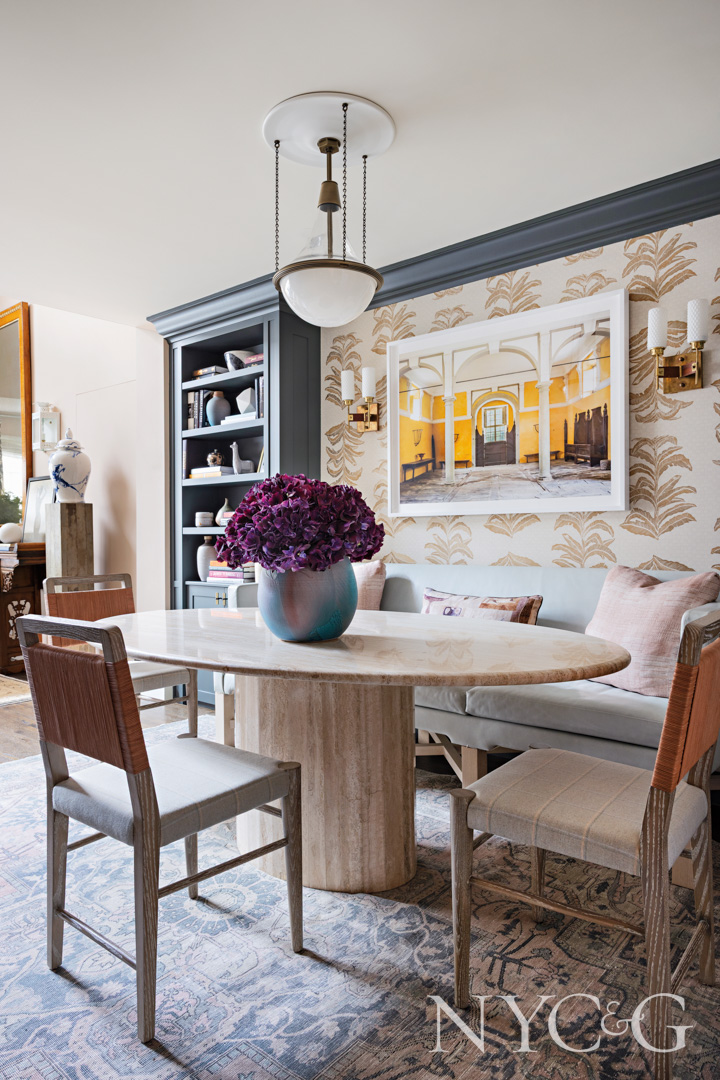 The apartment itself—a compact one-bedroom duplex located in a prewar building—didn’t require any major structural work, though the couple did opt to gut-renovate the primary bath and switch out the vanity and flooring in the powder room. The kitchen, however, remains untouched. Opposite the kitchen is the dining room, where Lucas has made the most of a small floor plan to provide the couple with as much storage as possible. He designed two dark green built-ins to flank a cozy eating area, while the cabinet on the opposite wall holds entertaining essentials such as barware. “One walks right into this room upon entering the apartment, so we selected a banana leaf wallpaper from Krane Home to bring more life into the space,” explains Lucas, who ran the wallpaper onto the door of the powder room as well in an effort to distract from its rather inconvenient location off the dining area. (However, when the door is open, a botanical wallpaper from Ferrick Mason makes its own chic statement.) “We landed on a banquette setup with a vintage travertine table, which works well for both entertaining and when the couple needs a place to work.”